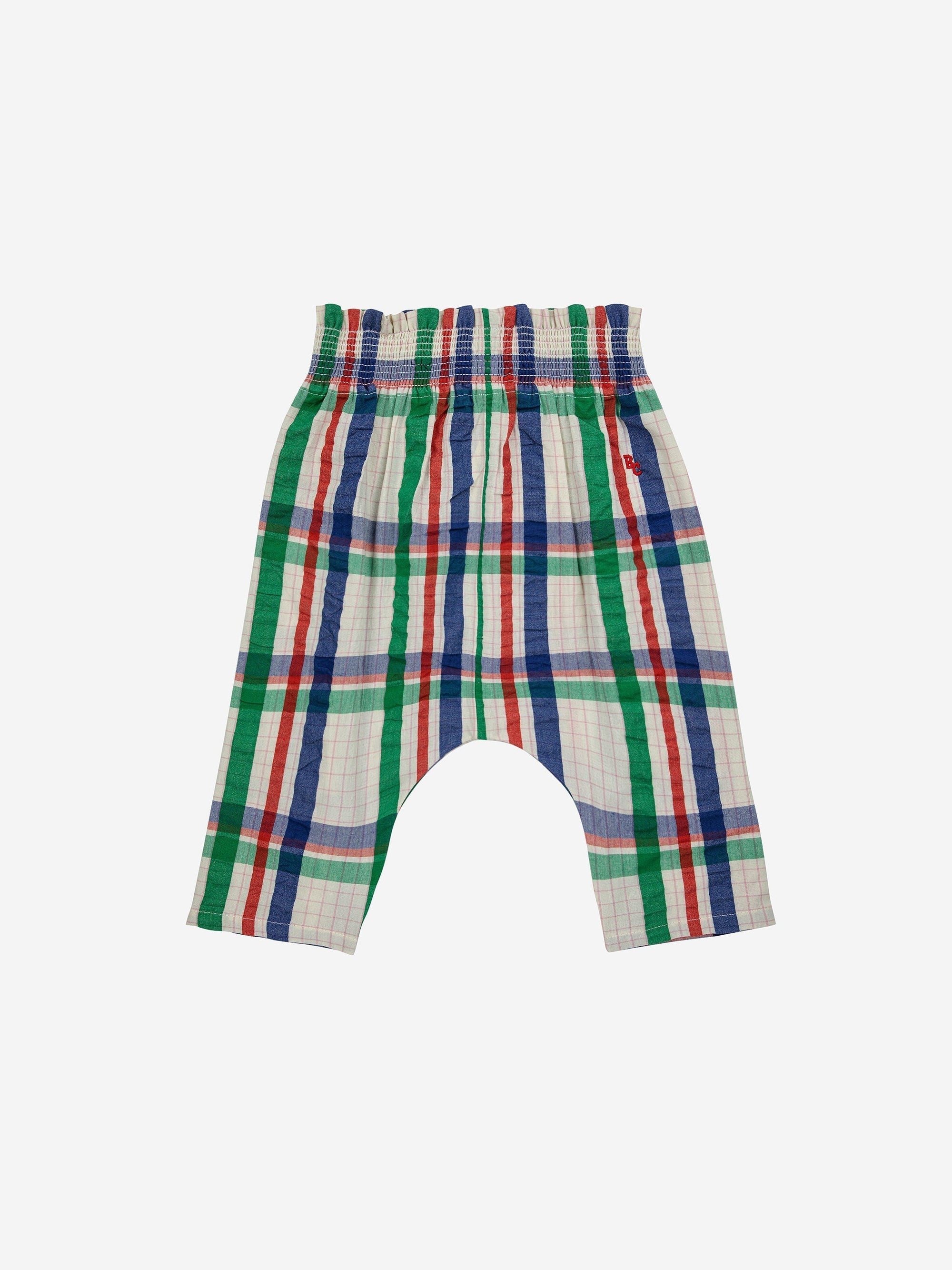 100%コットンのマルチカラーパンツ。伸縮性のあるウエストバンド、刺繍、ゆったりとしたフィット感、足首丈、ゆったりとした股上、フリルのディテールが特徴です。インド製。