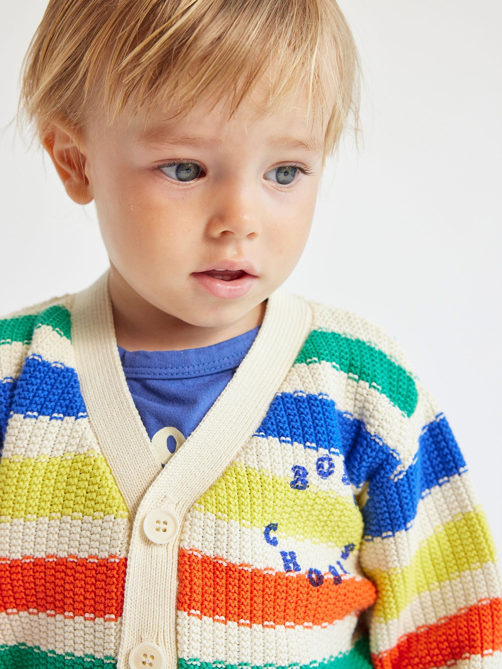 100%オーガニックコットンを使用したグリーンのカーディガン。Vネック、長袖、ドロップショルダー、フロントボタン留め、リブ編みの袖口、テクスチャーニット、ゆったりとしたフィット感、リブ編みの裾が特徴です。スペイン製。