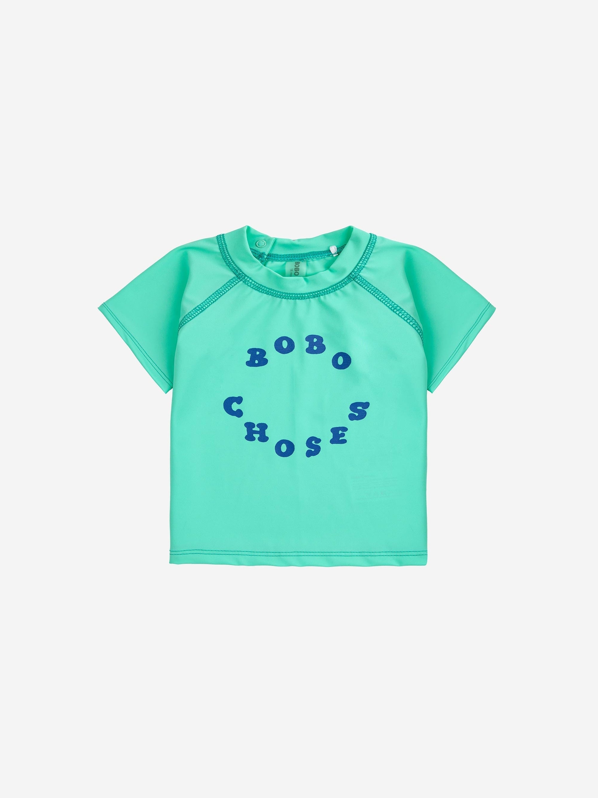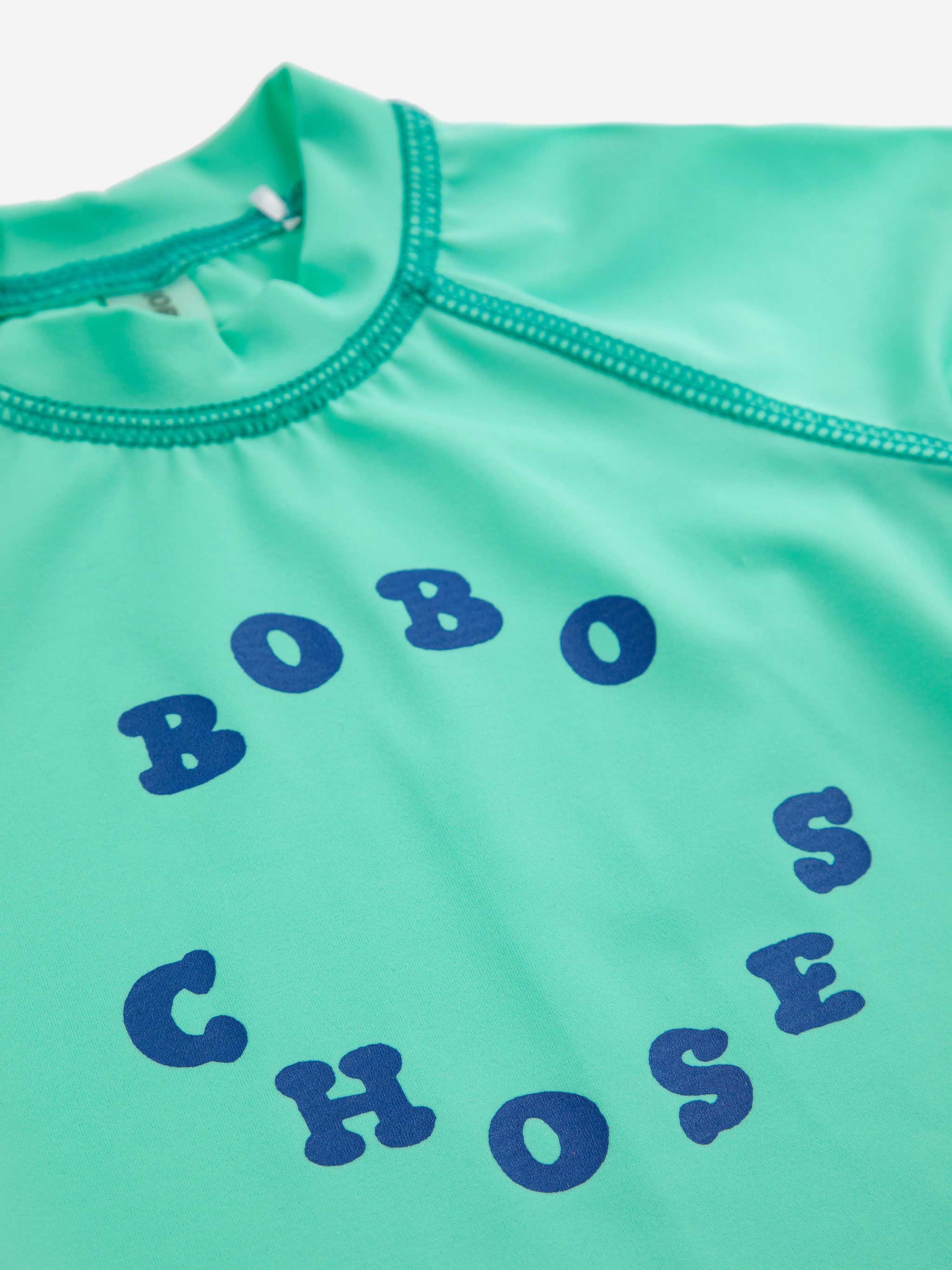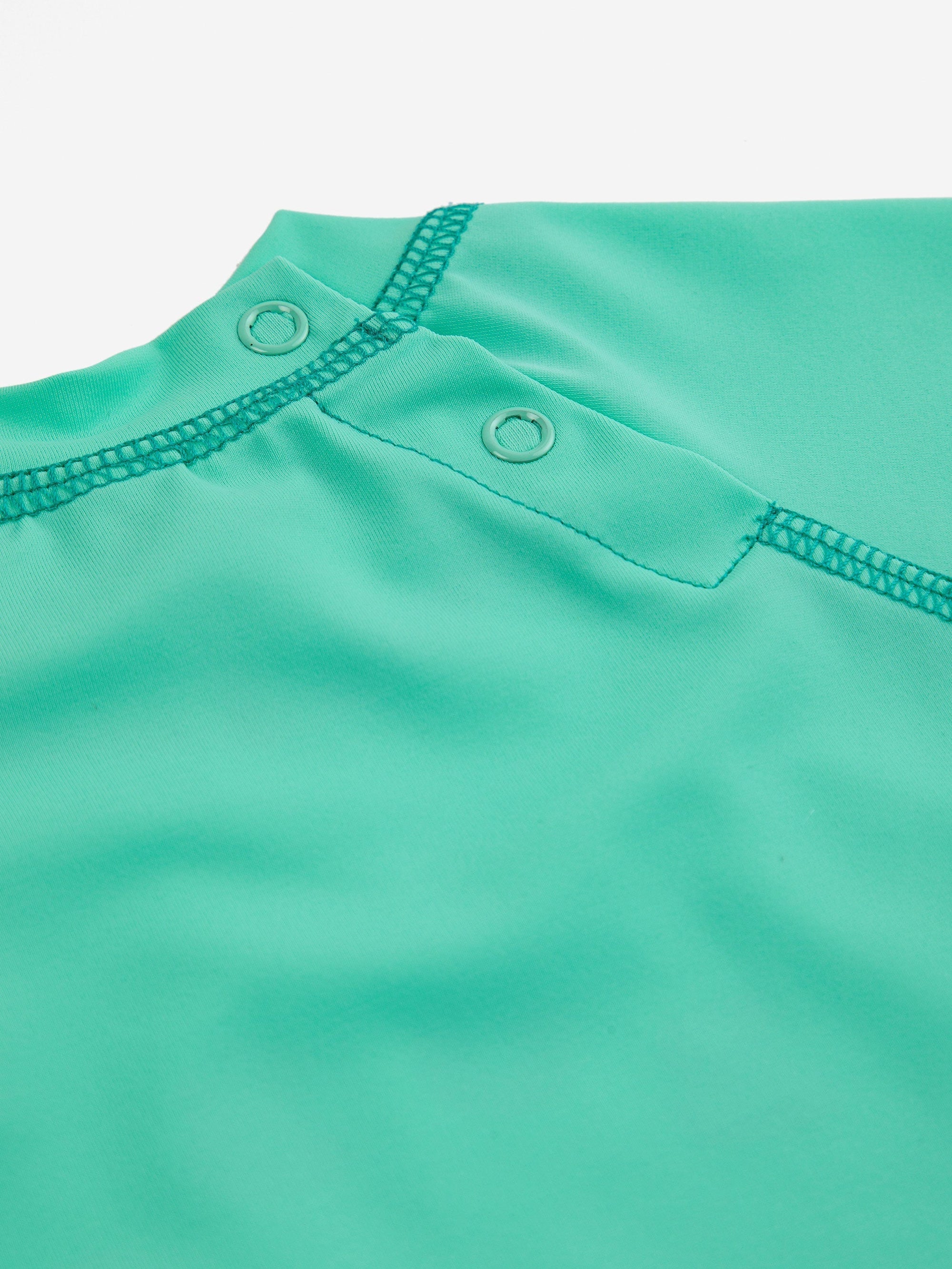 再生ポリアミド78%、エラスタン22%を使用したグリーンのスイムTシャツ。ラグランスリーブ、スリムフィット、ハイネック、肘丈の袖が特徴です。スペイン製。