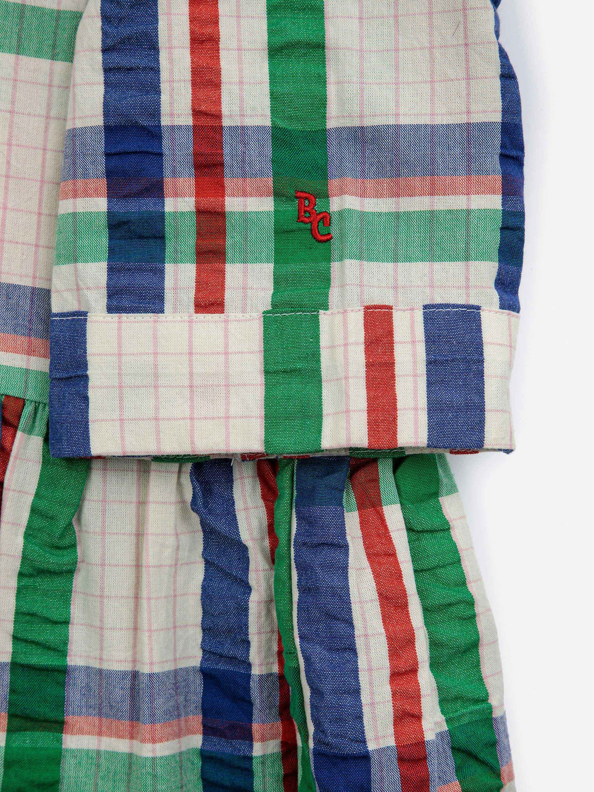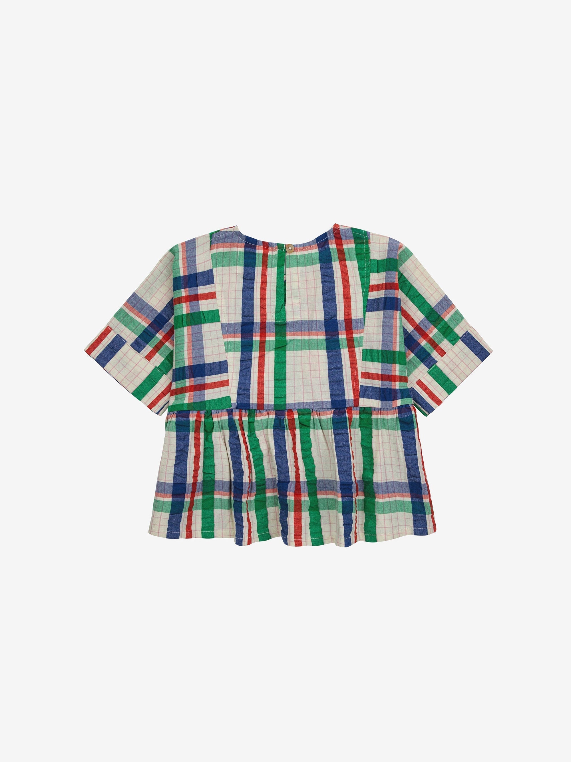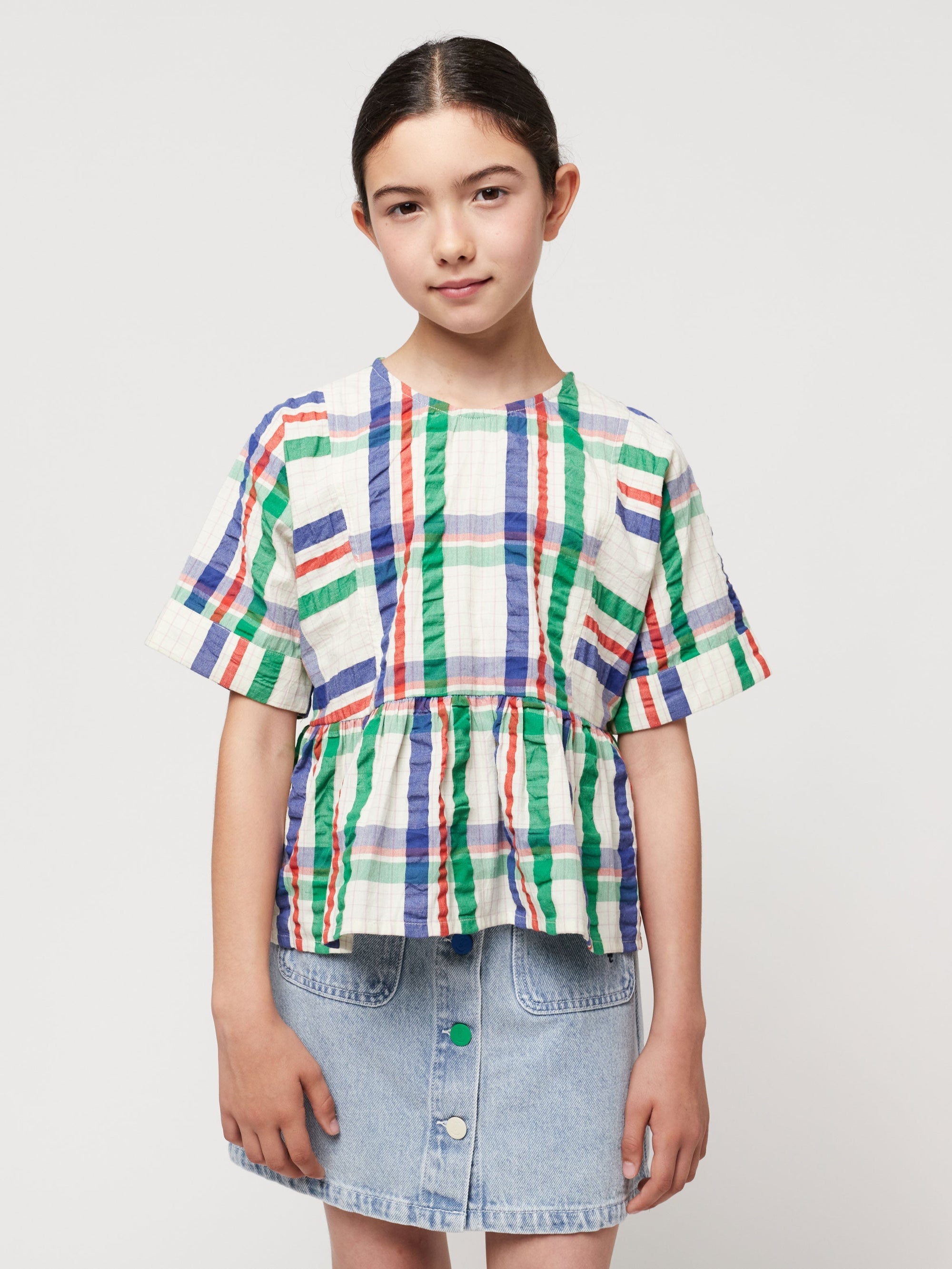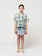 100%コットンのマルチカラーシャツ。半袖、フロントボタン留め、ギャザーディテール、刺繍、ゆったりとしたフィット感、ラウンドネックが特徴です。インド製。