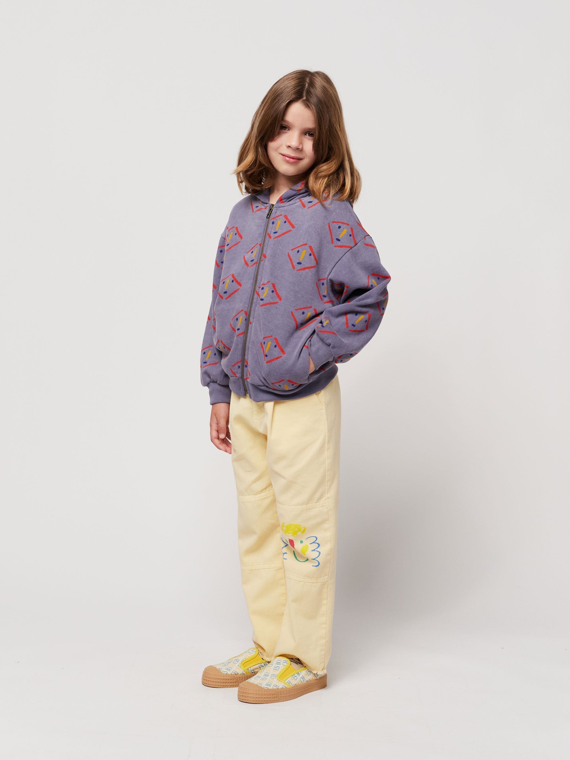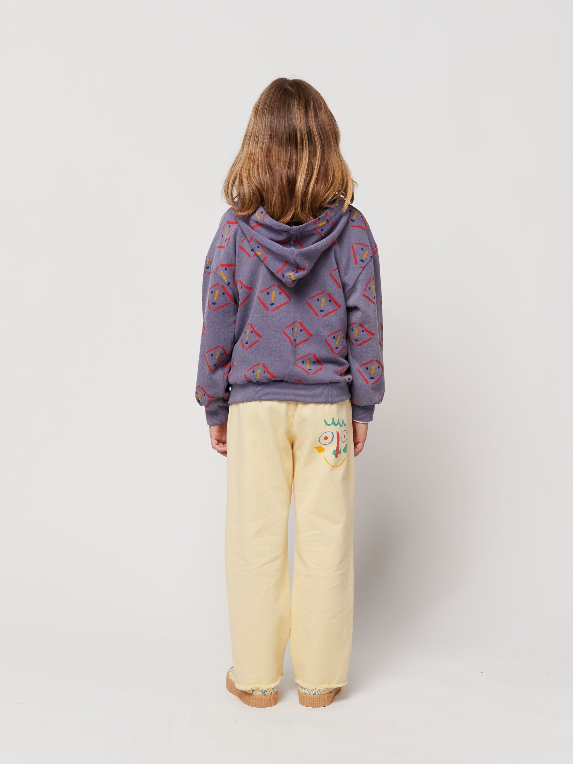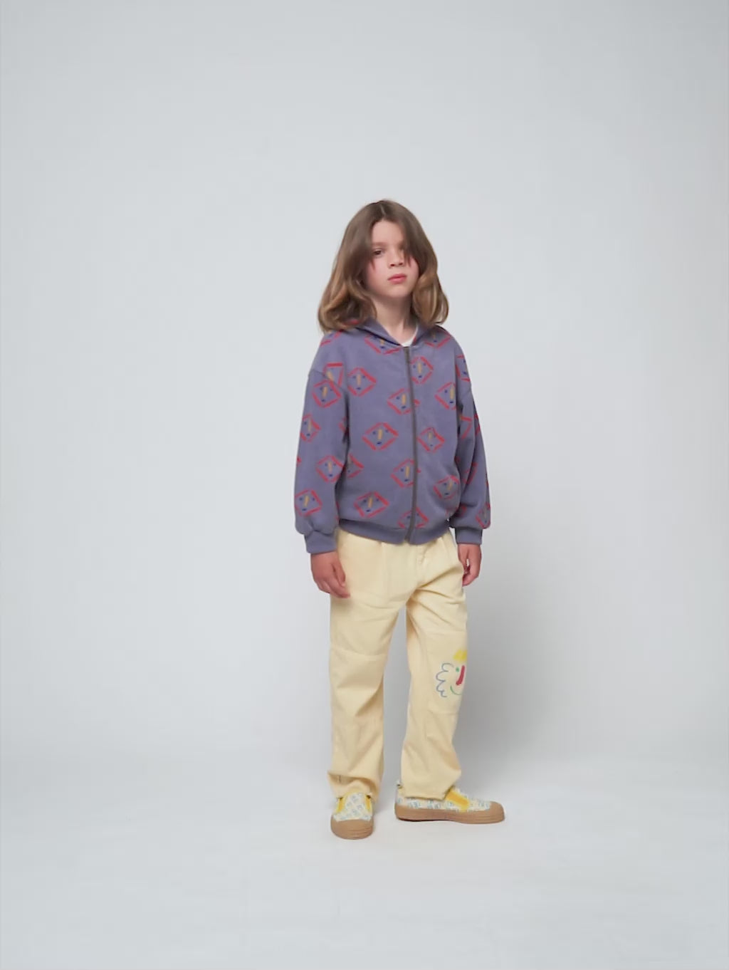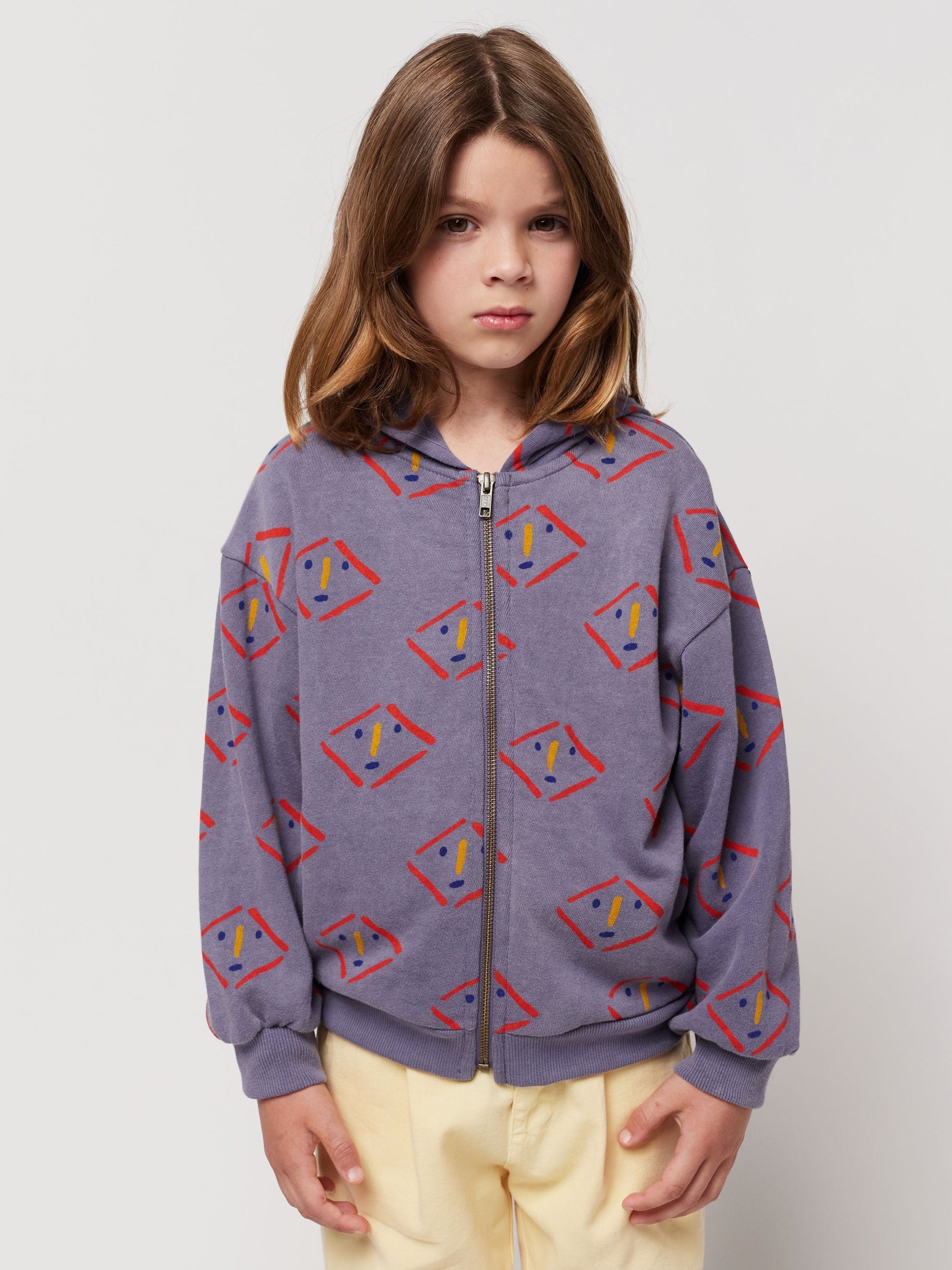 オーガニックコットン100%のプルシアンブルーのスウェットシャツ。フード付き、長袖、ジップアップ、リブ編みの袖口、ゆったりとしたフィット感、リブ編みの裾、シームポケット、フリース素材。スペイン製。
