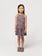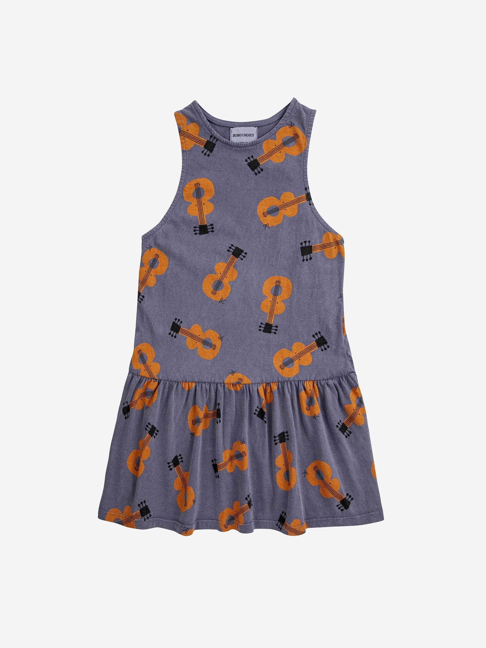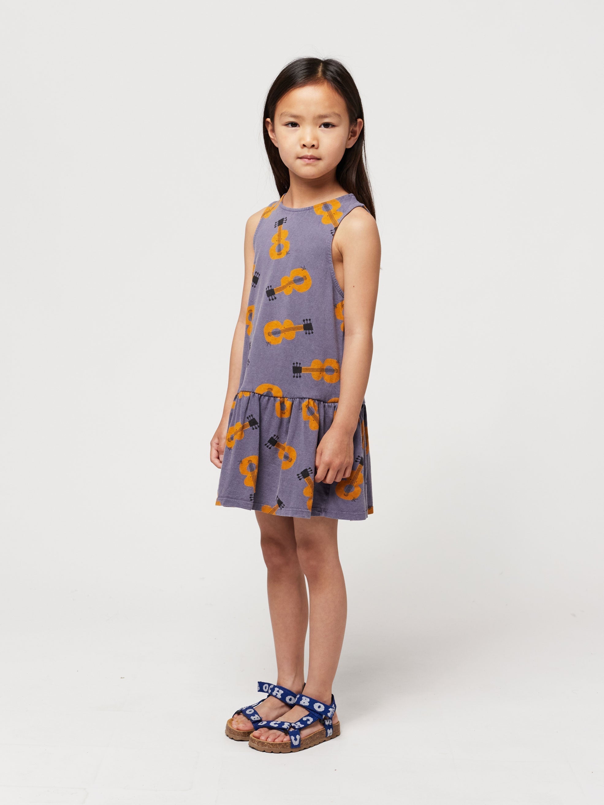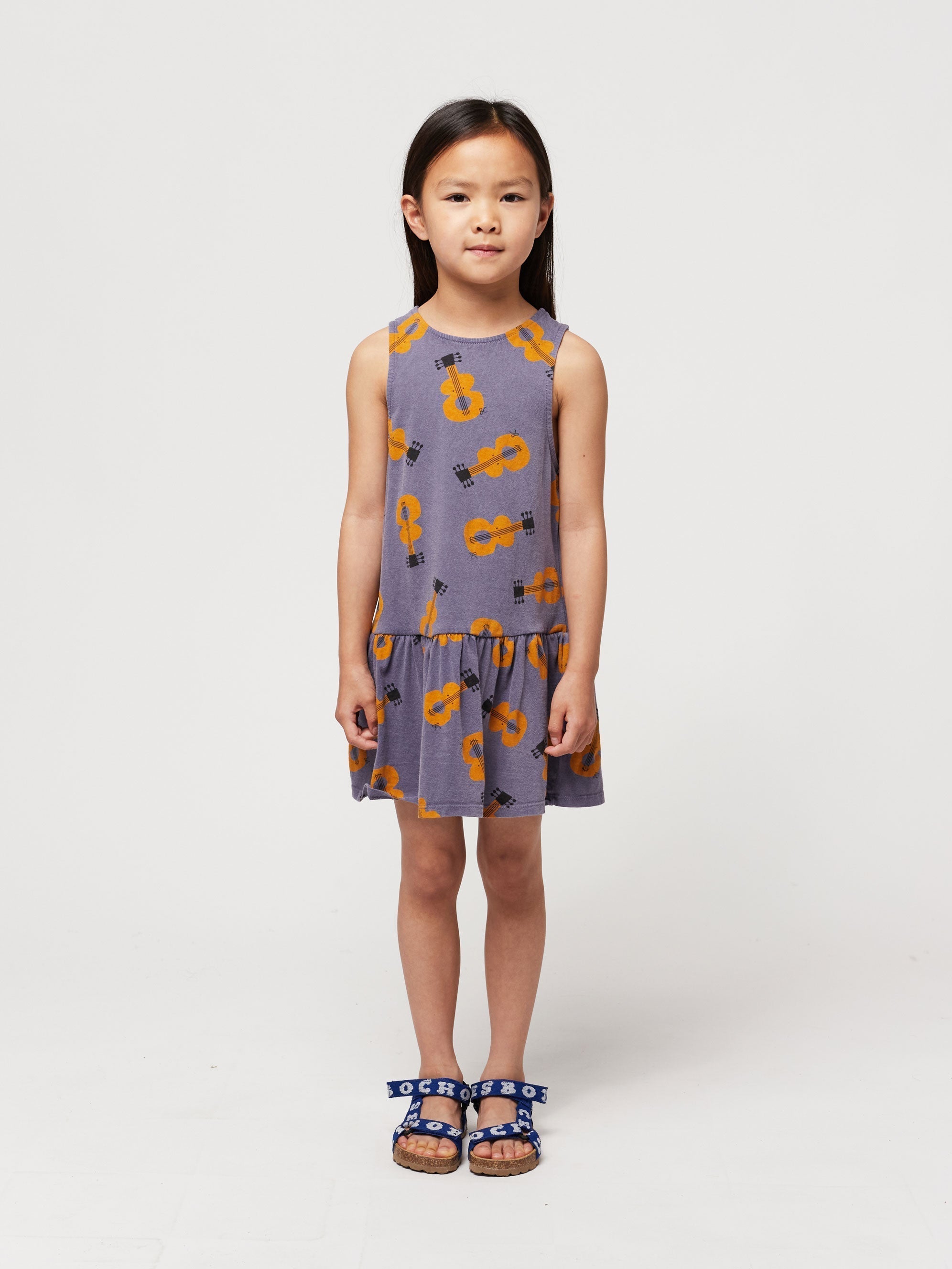 100%オーガニックコットンを使用したプルシアンブルーのドレス。ノースリーブ、エバセフィット、ギャザー入りの裾、ショート丈のラウンドネックが特徴です。スペイン製。