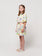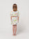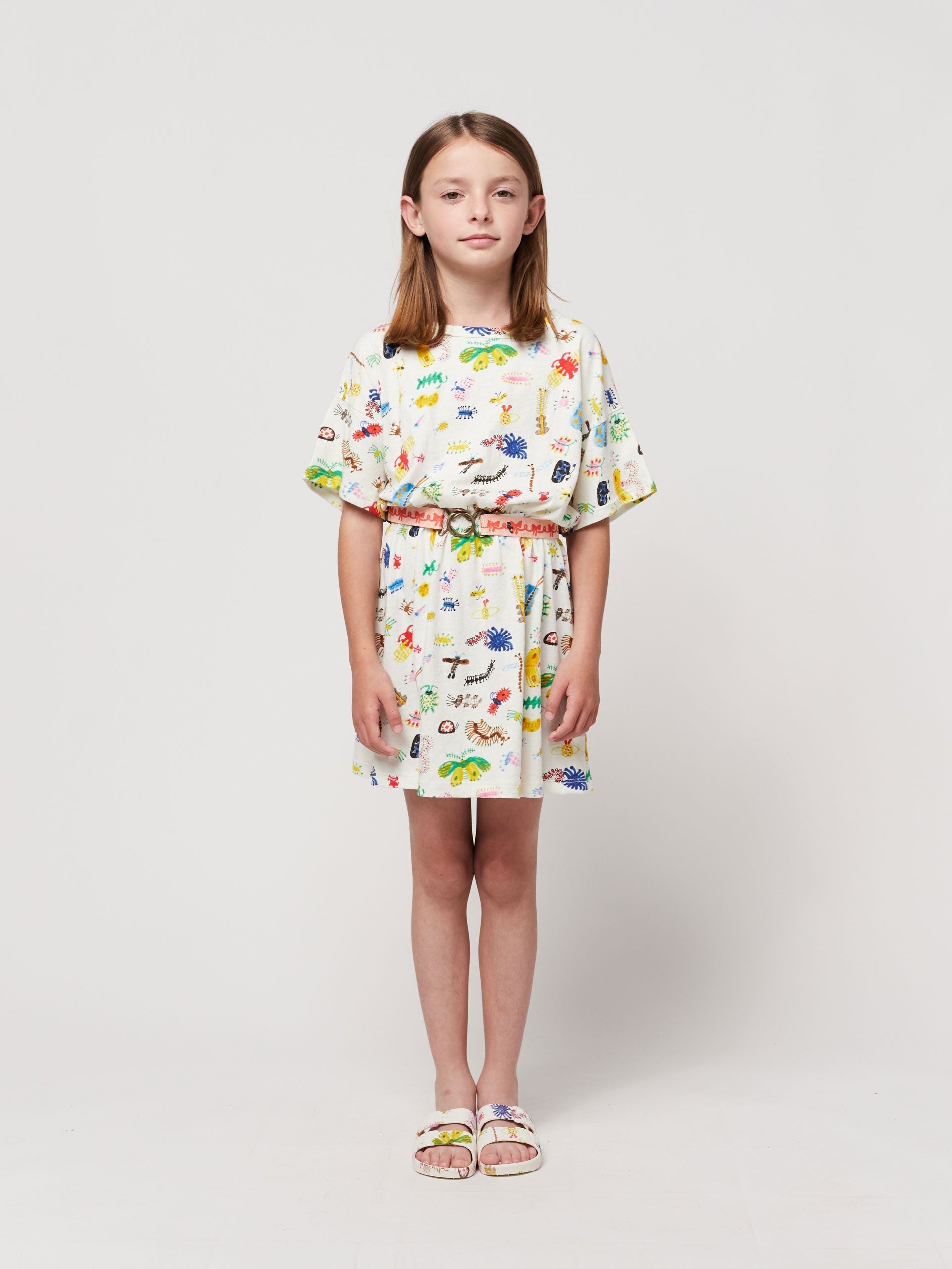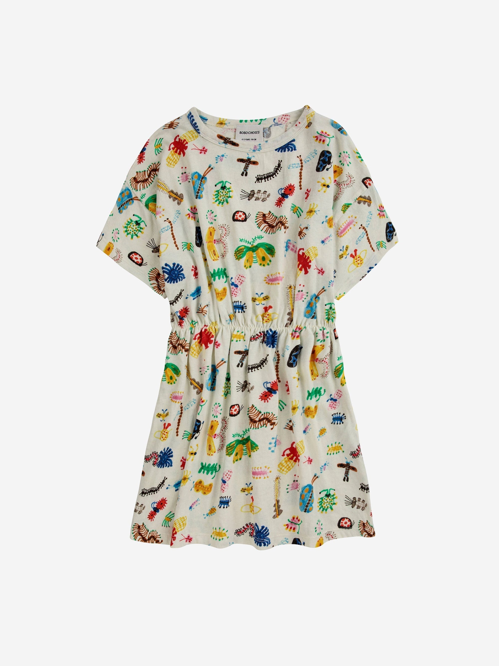 100%オーガニックコットンを使用したオフホワイトのドレス。半袖、伸縮性のあるウエストバンド、エバセフィット、ショート丈のラウンドネックが特徴です。ポルトガル製。