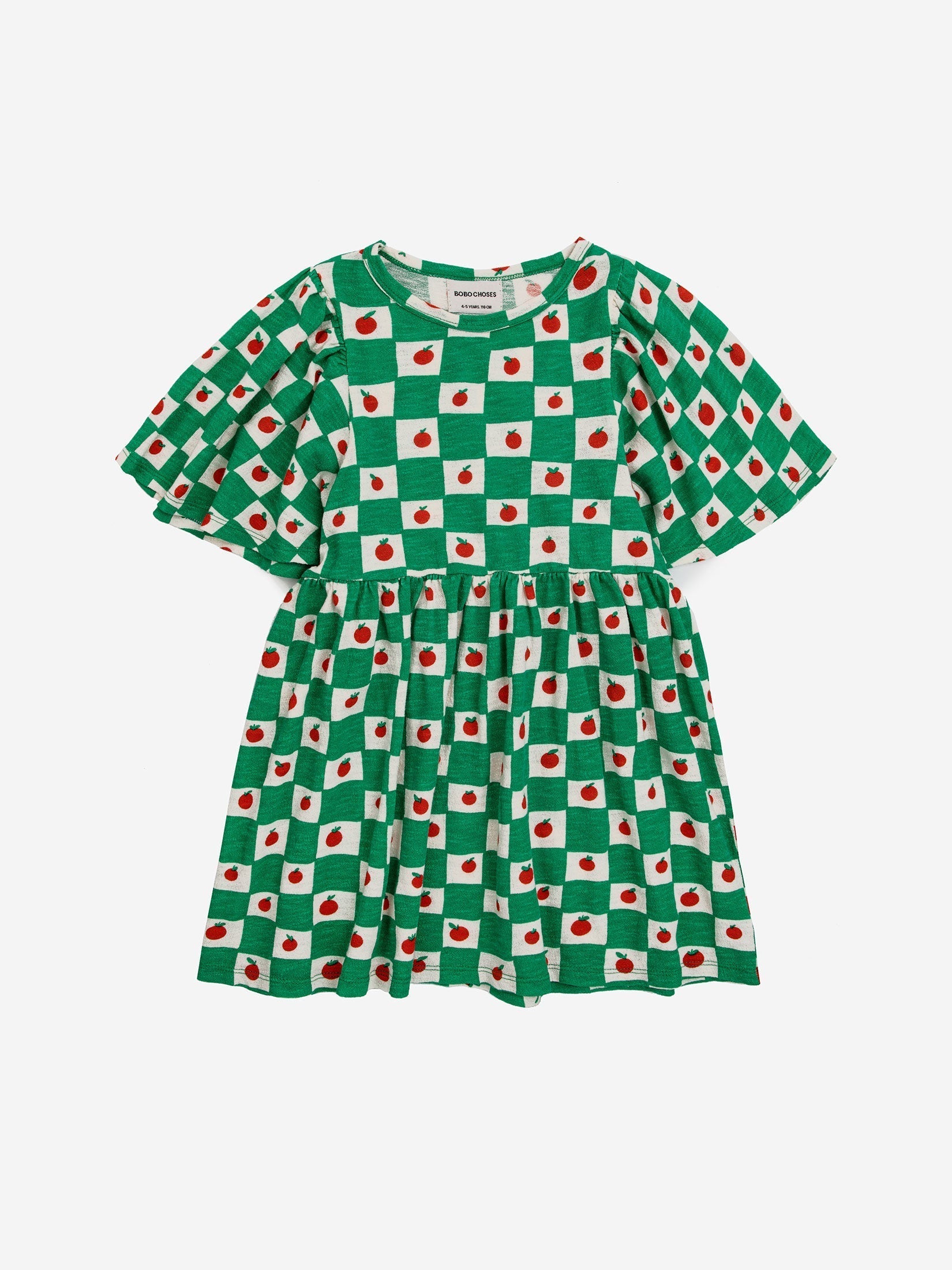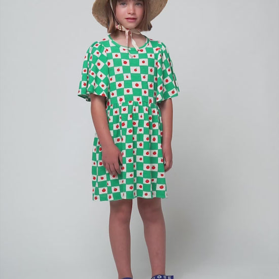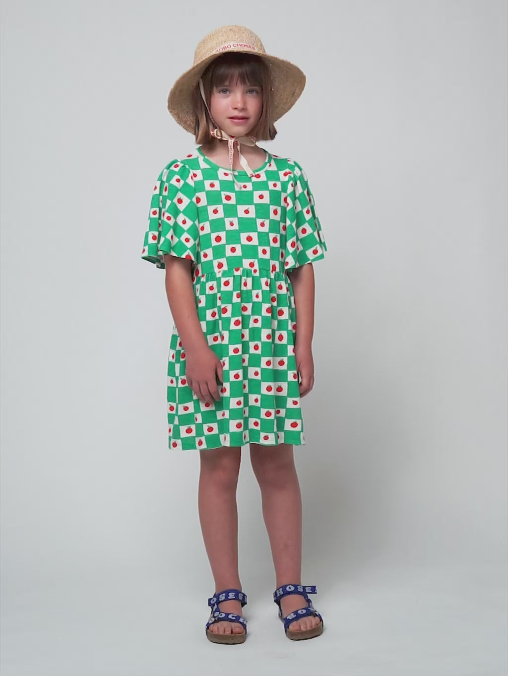 100%オーガニックコットンのオフホワイトドレス。半袖、ギャザーディテール、エバセフィット、ショート丈、ラウンドネック、フレアスリーブ、素朴な生地が特徴です。スペイン製。
