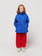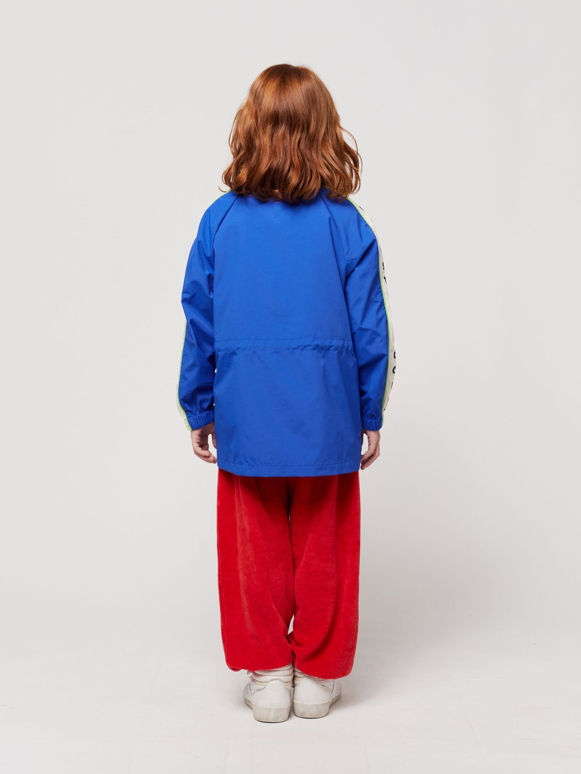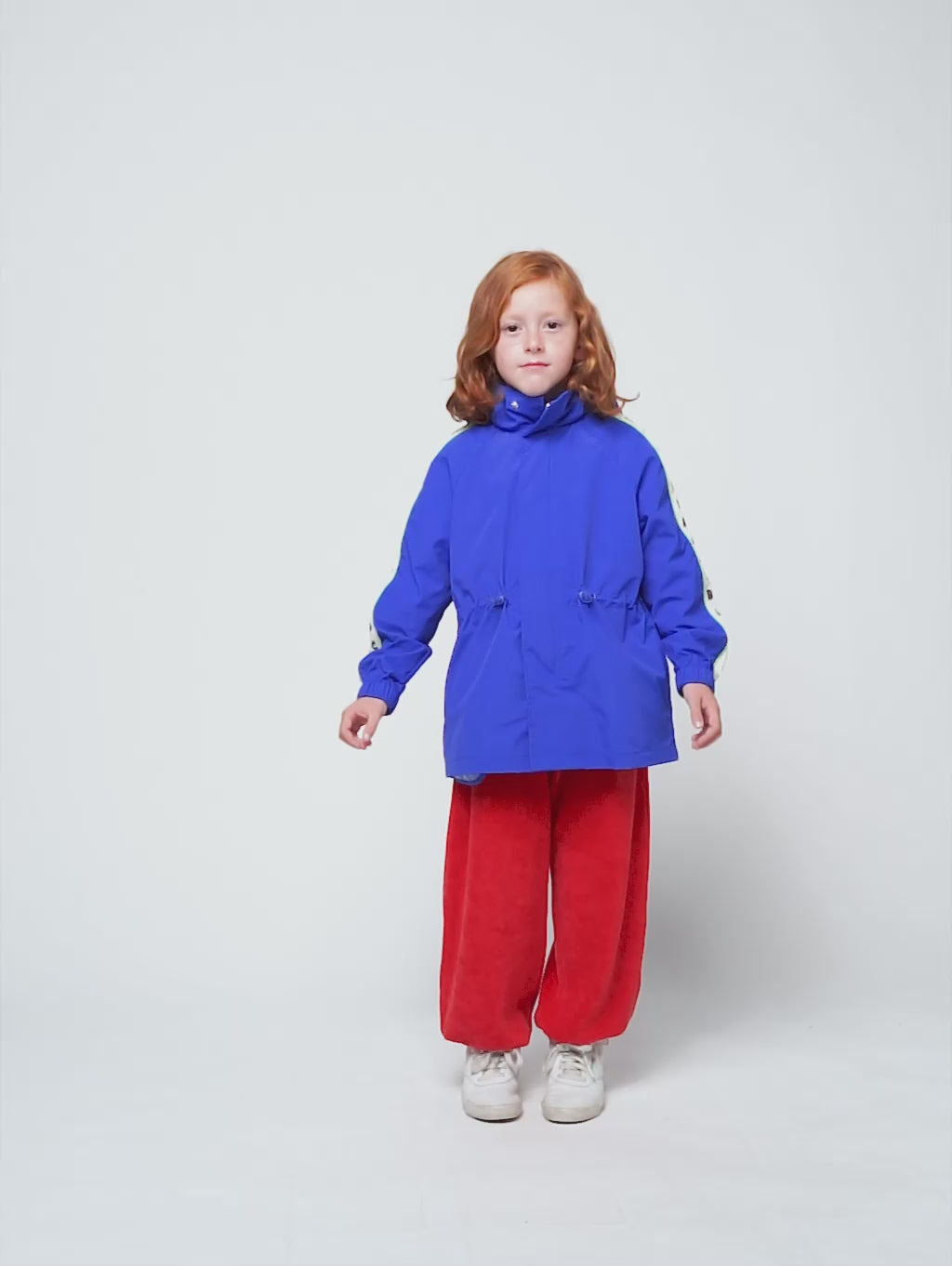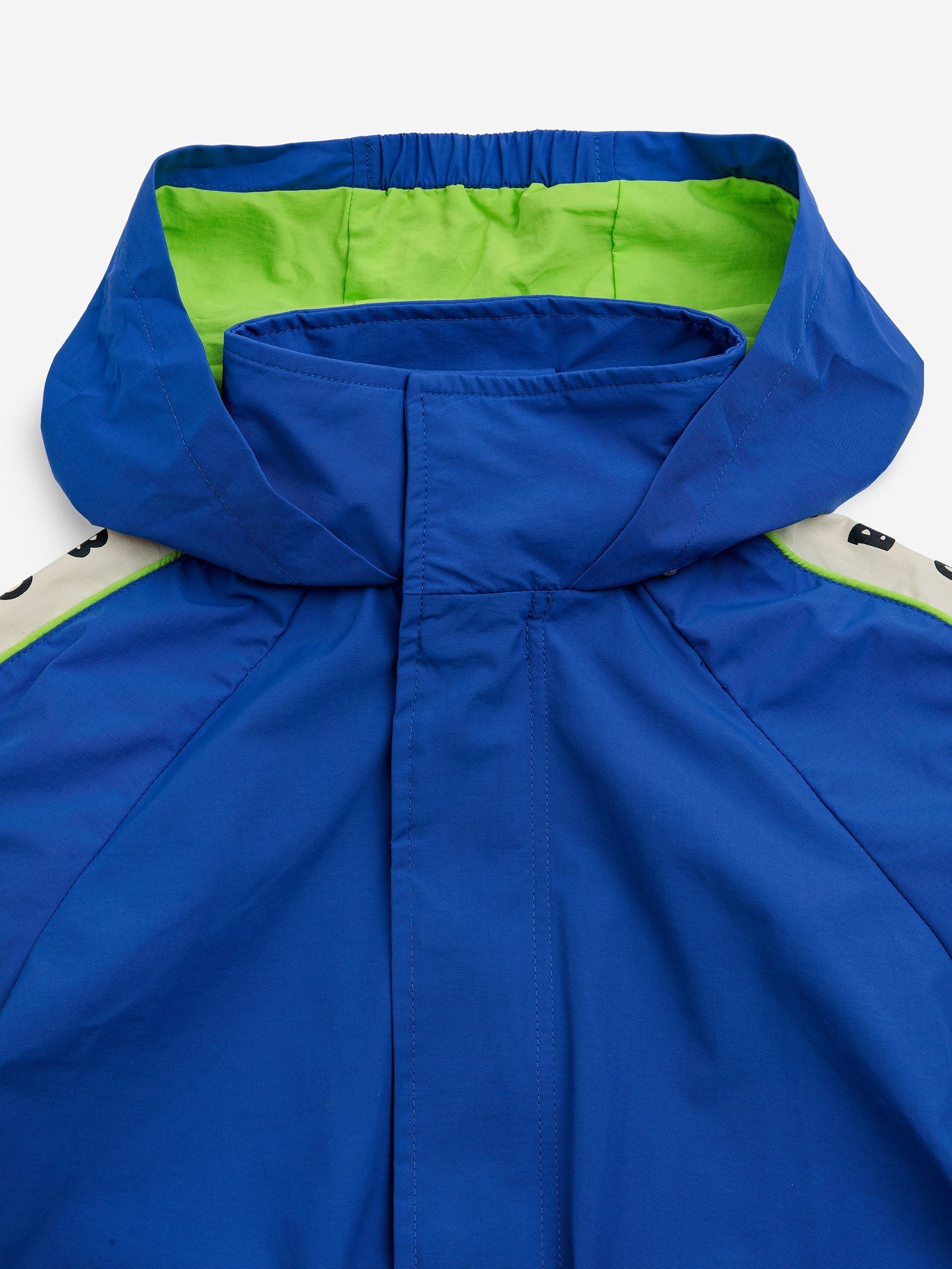 ポリアミド100%のブルーのアウターウェア。フード付き、調節可能なウエストバンド、フロントスナップボタン留め、フロントジッパー留め、伸縮性のある袖口、ゆったりとしたフィット感、調節可能なドローストリング、膝上丈、シームポケットが特徴です。中国製。