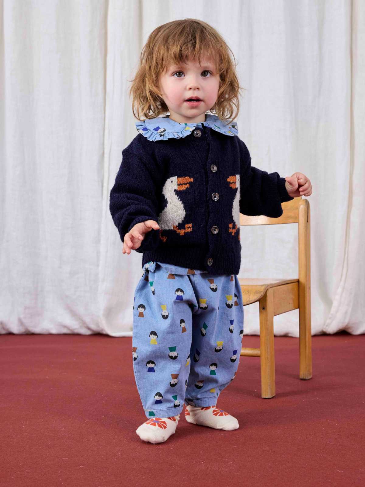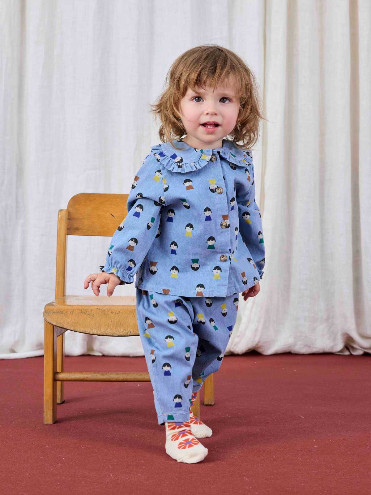 やさしいライトブルーが爽やかな印象を与えるベビーブラウス。ピーターパンカラーの丸襟とフロントボタンがクラシカルな雰囲気を演出し、胸元に施された刺繍やフリルディテールが可愛らしさを添えています。長袖にゴム仕様の袖口を組み合わせ、着やすさと動きやすさにも配慮しております。