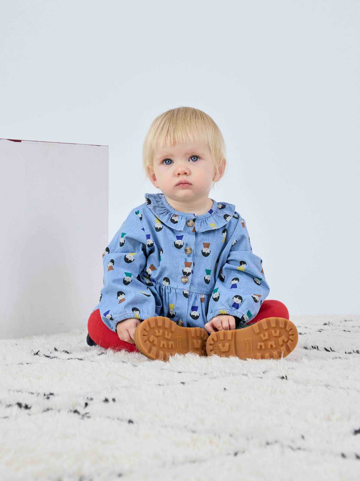 長袖にドロップショルダー、フロントのボタン開閉、伸縮性のある袖口を備えています。刺繍やフリルのディテールが華やかさを添え、デニム素材で仕立てられた一着。エヴァゼシルエットと膝下丈で上品な印象に仕上げ、ラウンドネックがクラシカルな雰囲気を演出します。スペイン製。