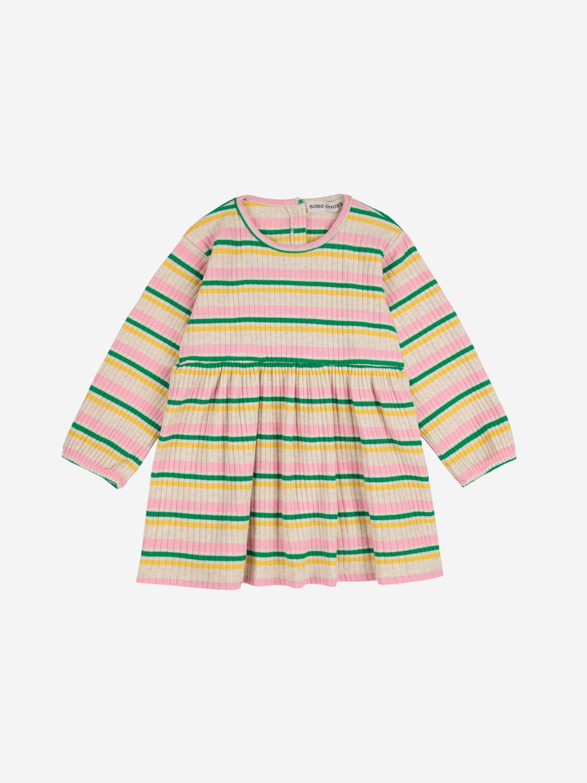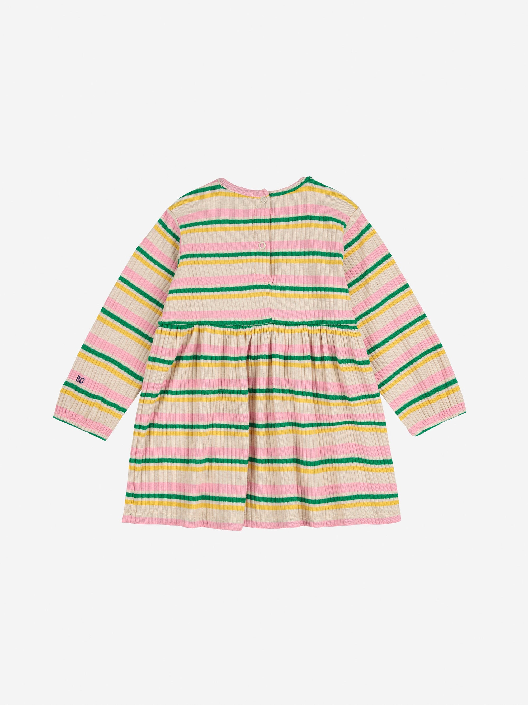 ドロップショルダーとゆとりのあるエヴァゼシルエットで、赤ちゃんが快適に動けるようデザインされています。背面のボタン開閉で着脱がしやすく、袖口はゴム仕様でずれにくい仕上がり。ラウンドネックと膝下丈が上品なバランスを生み出し、特別感のある一枚に仕上がっています。