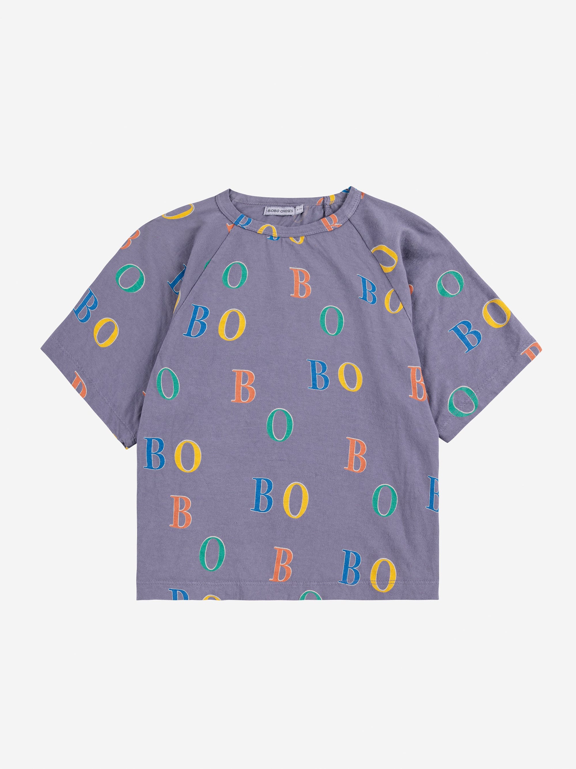 ネイビーブルーのTシャツは、「BOBO」の文字をちりばめた遊び心あるデザインが特徴のKIDS用アイテムです。オーガニックコットン100%を使用し、柔らかく肌にやさしい着心地を実現。ショートスリーブのラグランスリーブ仕様で動きやすさを高め、ルーズフィットのシルエットは快適な着用感を提供します。ラウンドネックのシンプルなフォルムにユニークなロゴデザインがアクセントとなり、日常のスタイリングに個性をプラス。サステナブルな素材を用いた、夏のコーディネートを楽しく彩る一枚です。