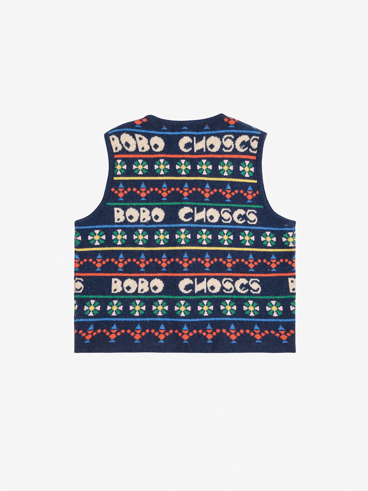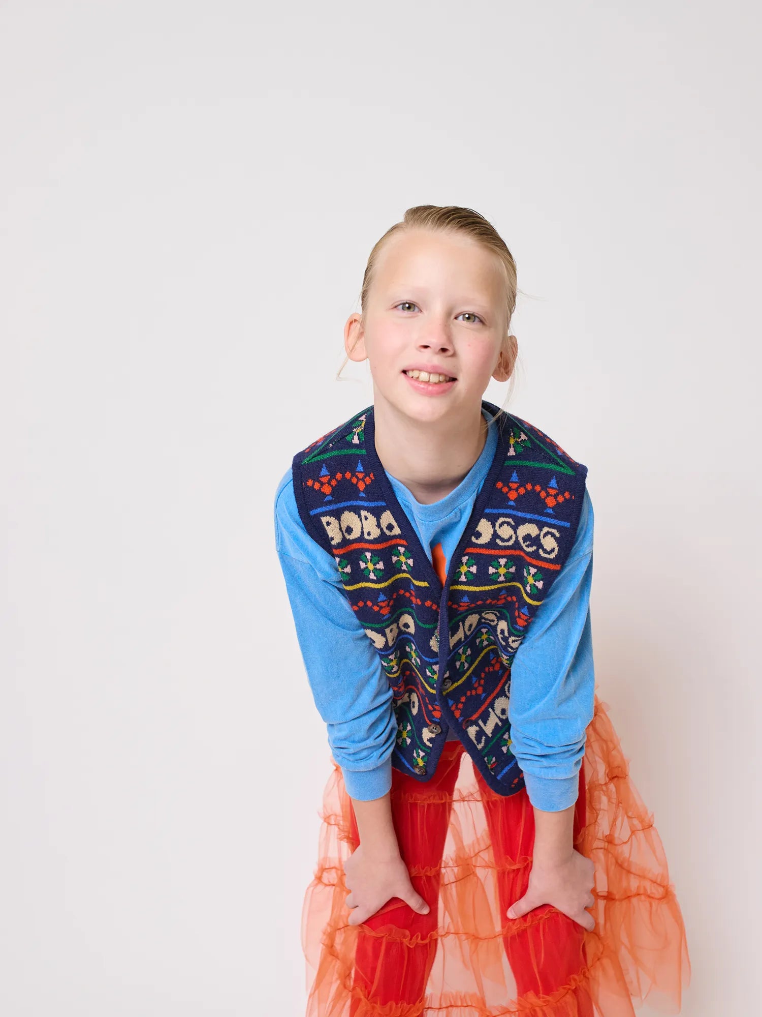 5% リサイクルカシミヤ、35% リサイクルポリアミド、30% リサイクルビスコース、30% リサイクルウールのマルチカラー カーディガン。Vネック、ノースリーブ、前ボタン留め、ジャガード、ルーズフィットデザイン。スペイン製。