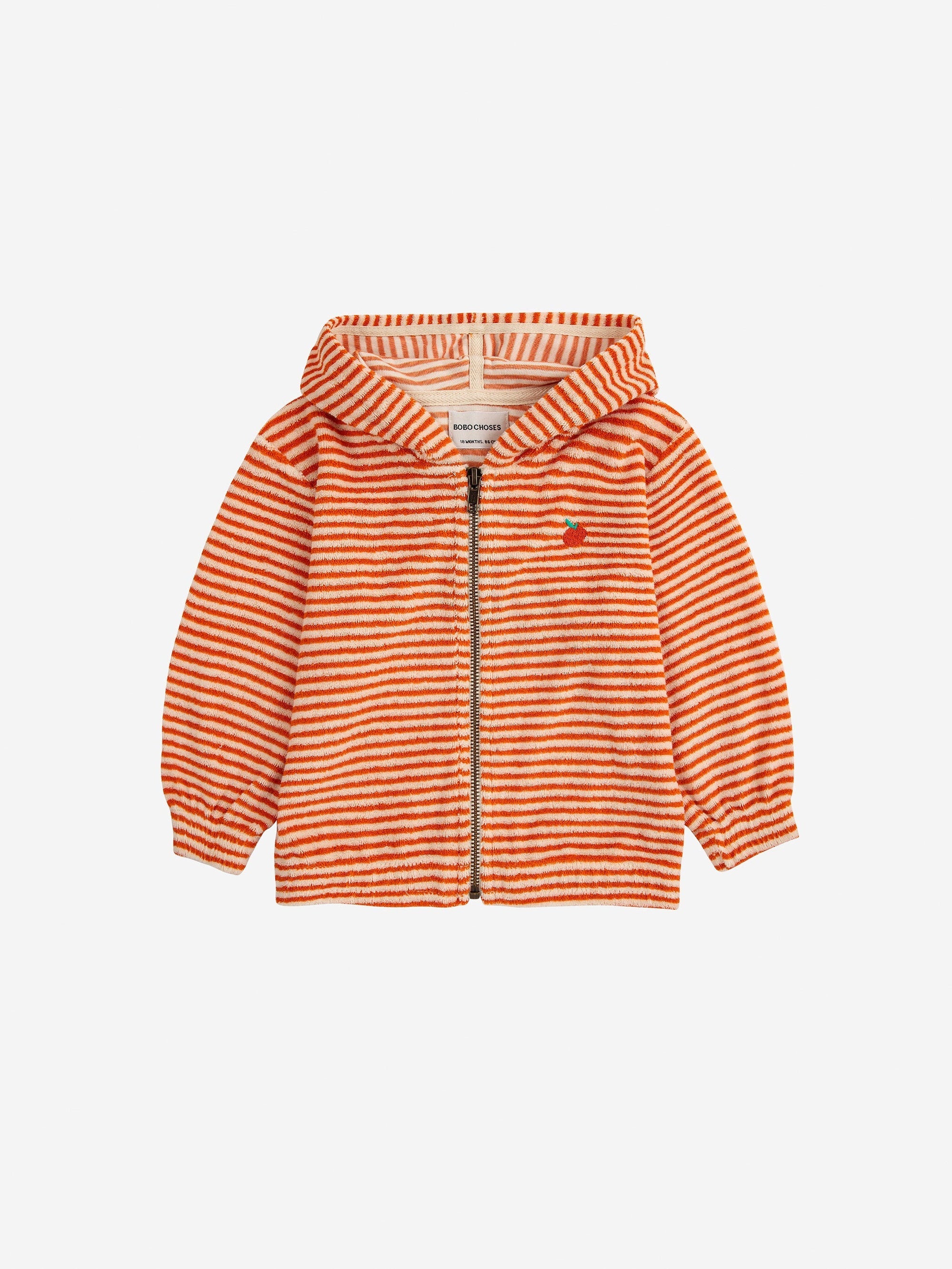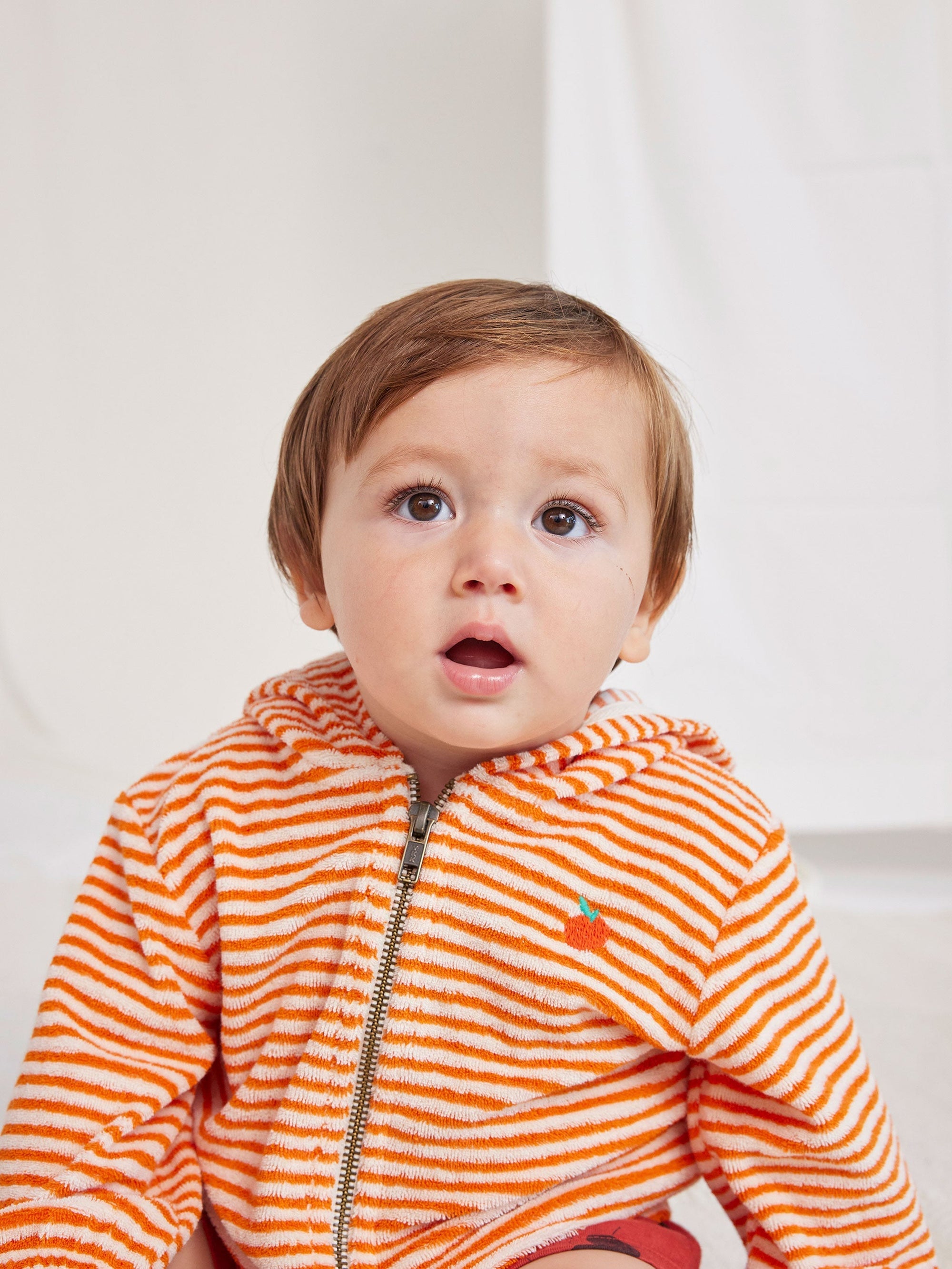 46% organic cotton, 42% cotton, 12% polyester orange sweatshirt. Designed with hooded, long sleeves, dropped shoulder, front button fastening, ribbed cuffs, embroidery, loose fit, ribbed bottom and fleece. Made in Spain.