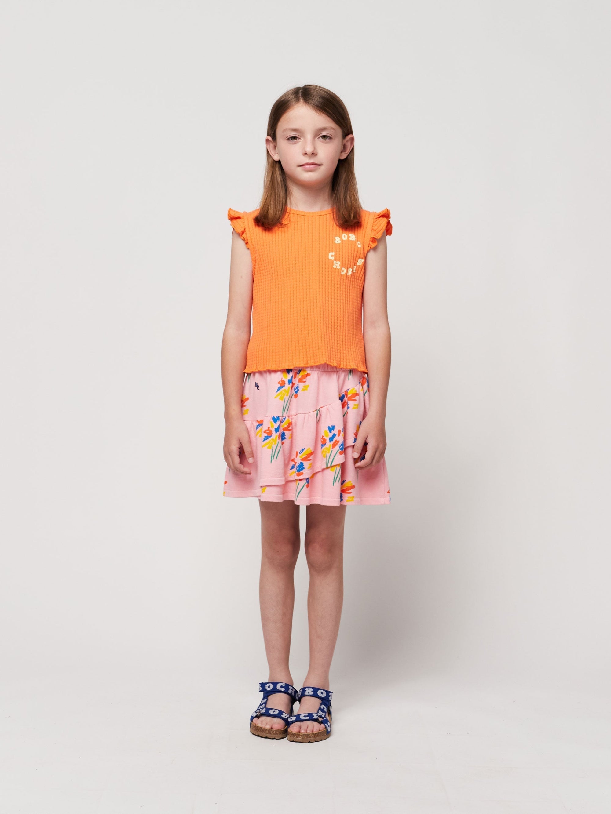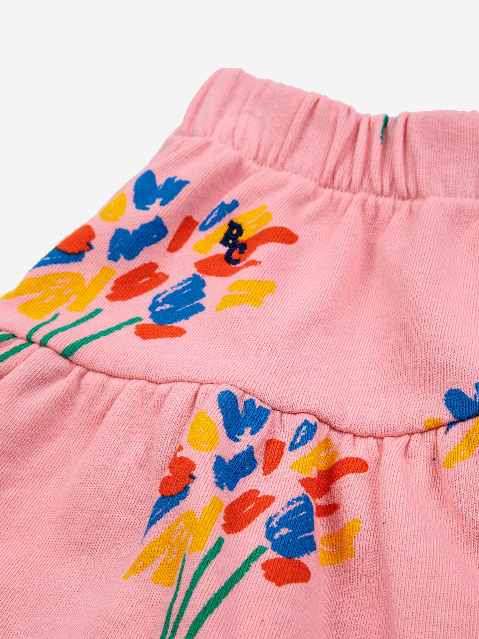 100% organic cotton pink skirts. Designed with elasticated waistband, embroidery, evasé fit, short, fleece and ruffled detailing. Made in Spain.