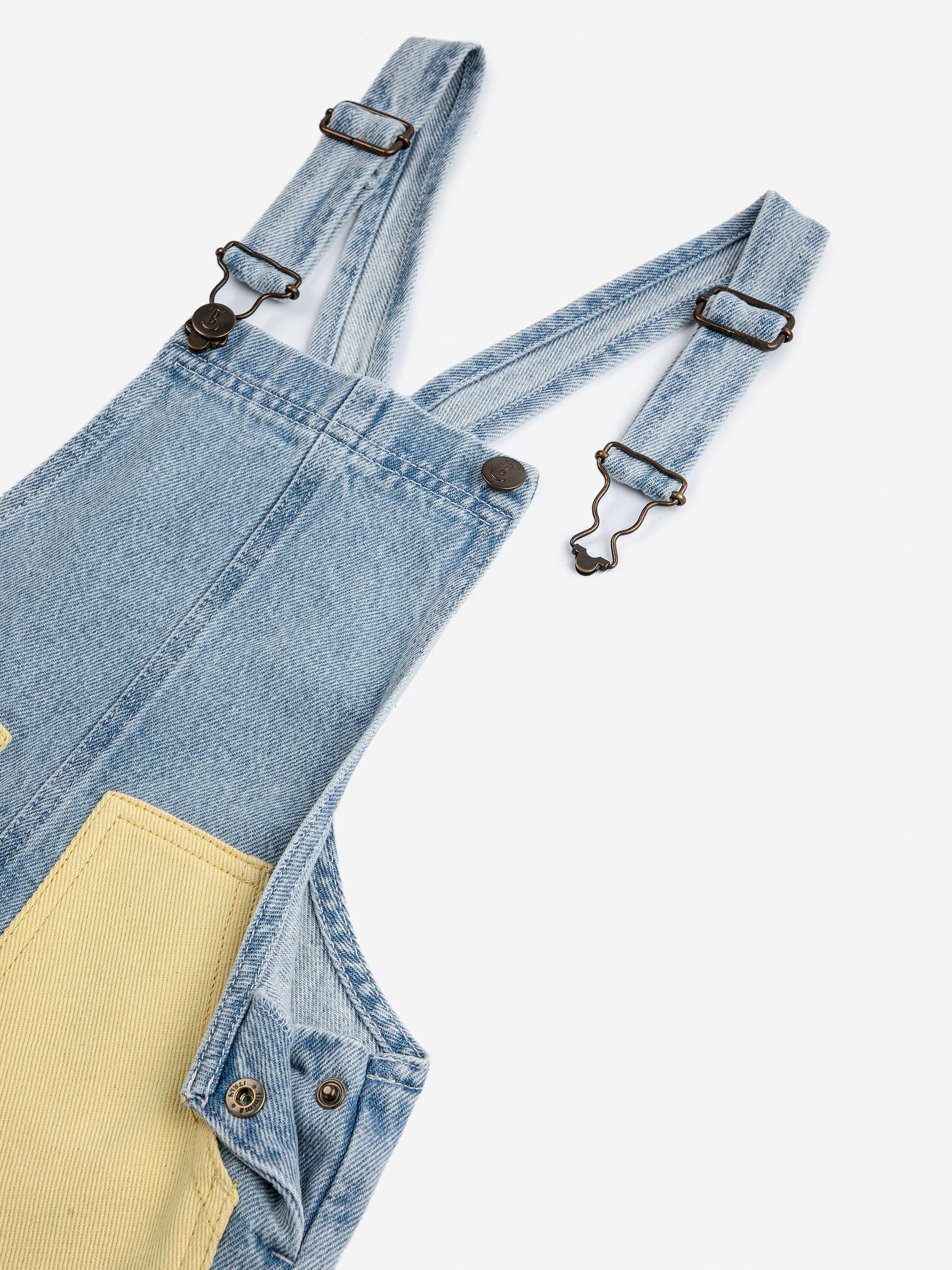 76% cotton, 24% recycled cotton light blue playsuit. Designed with adjustable straps, front button fastening, loose fit, over knee length, patch pocket, denim and relaxed crotch. Made in Portugal.