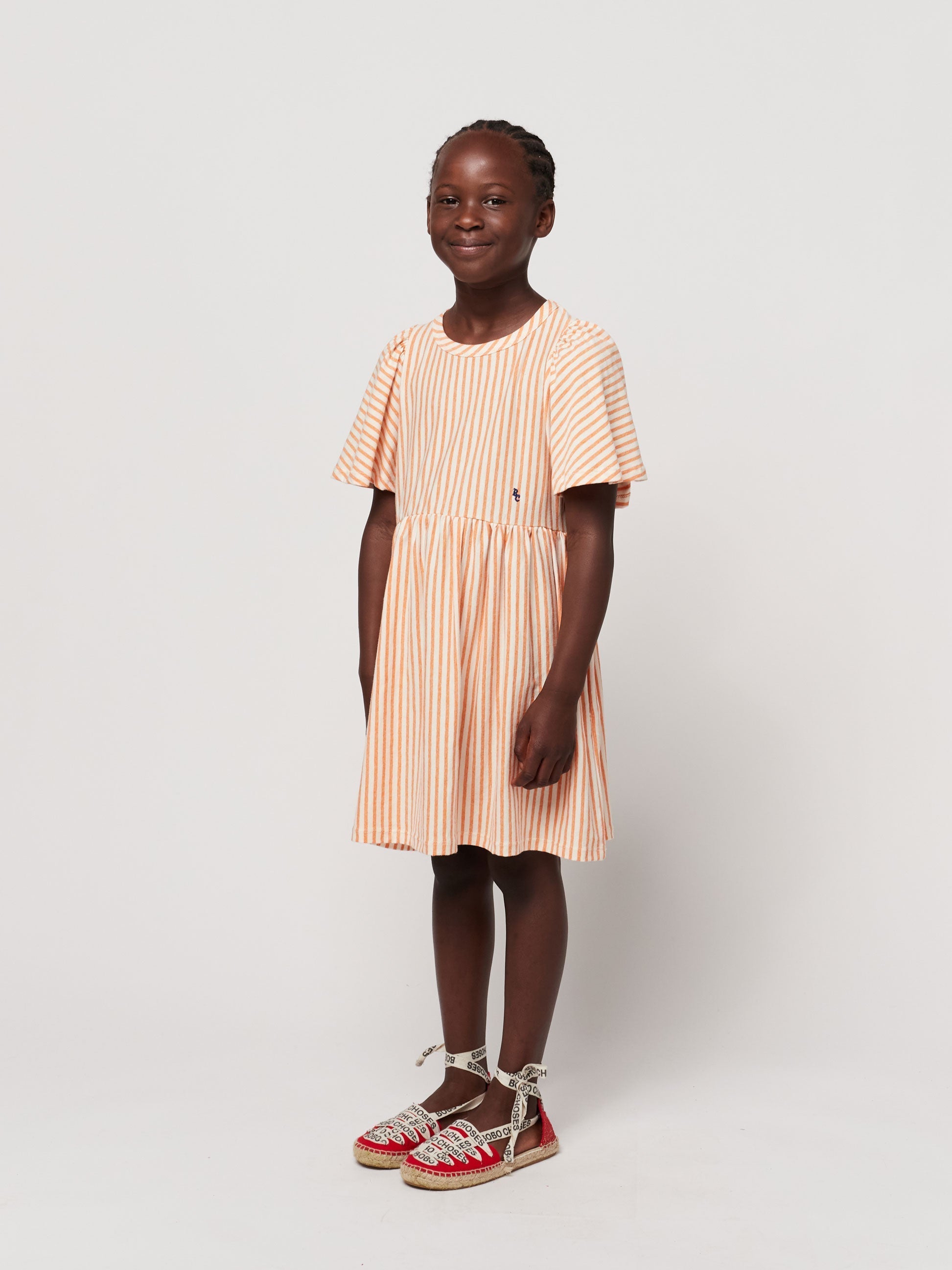 50% organic cotton, 50% cotton orange dress. Designed with short sleeves, gathering detail, embroidery, evasé fit, short, round neck and flare sleeve. Made in Spain.