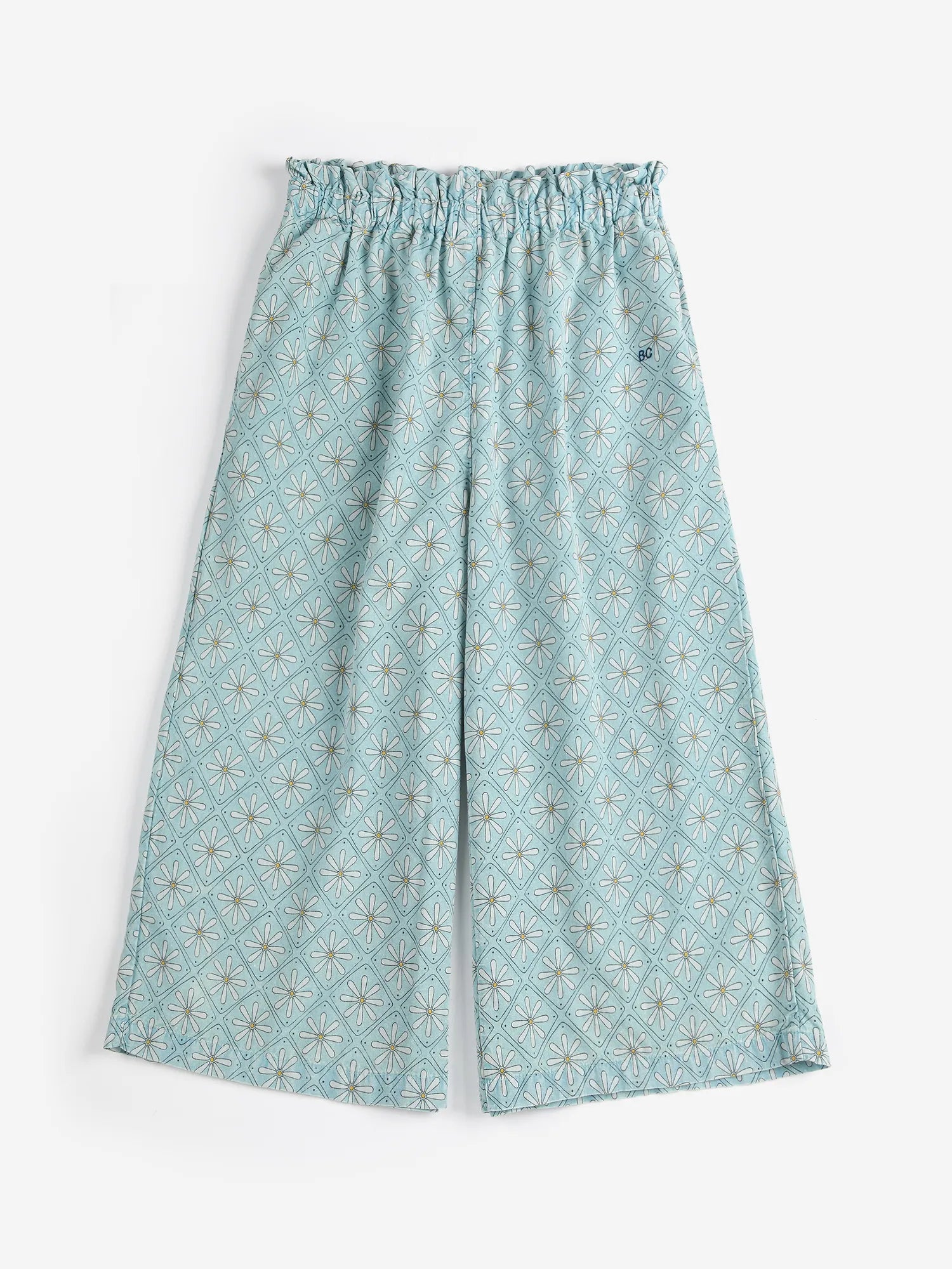 Light blue pants. Designed with elasticated waistband, embroidery, evasé fit, ankle length, seam pocket and ruffled detailing. Made in Spain.