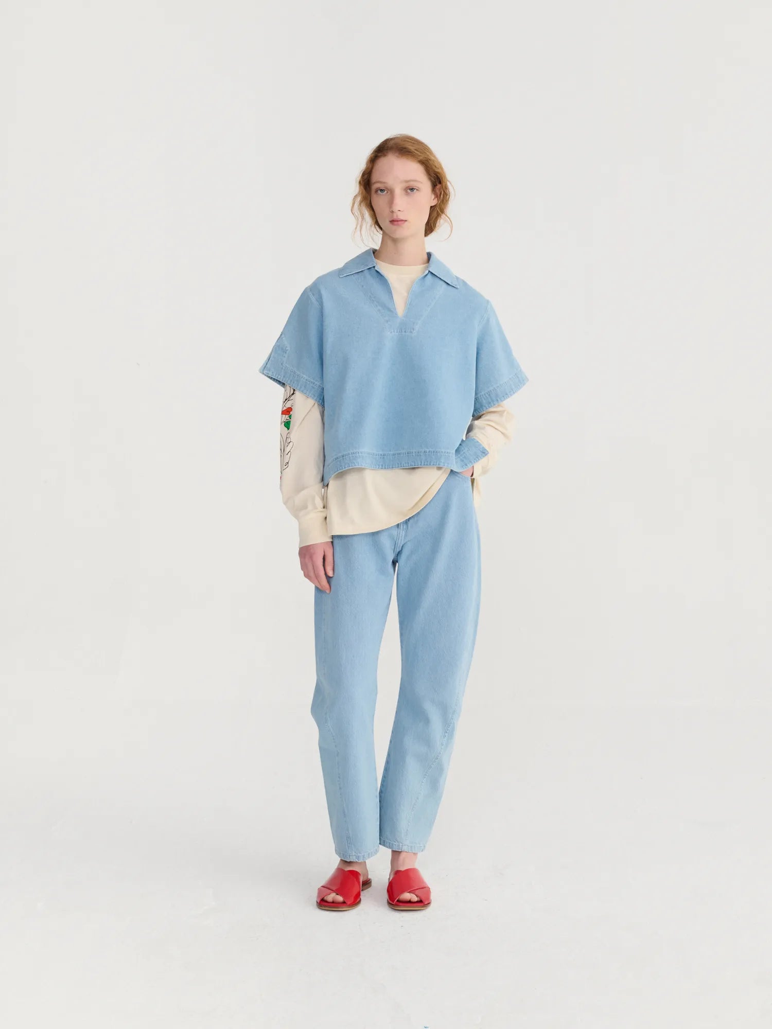 Light blue pants. Designed for a relaxed fit, slouchy / cocoon, non stretchy fabric and designed with pockets. Fits true to size, take your normal size. Made in Portugal.