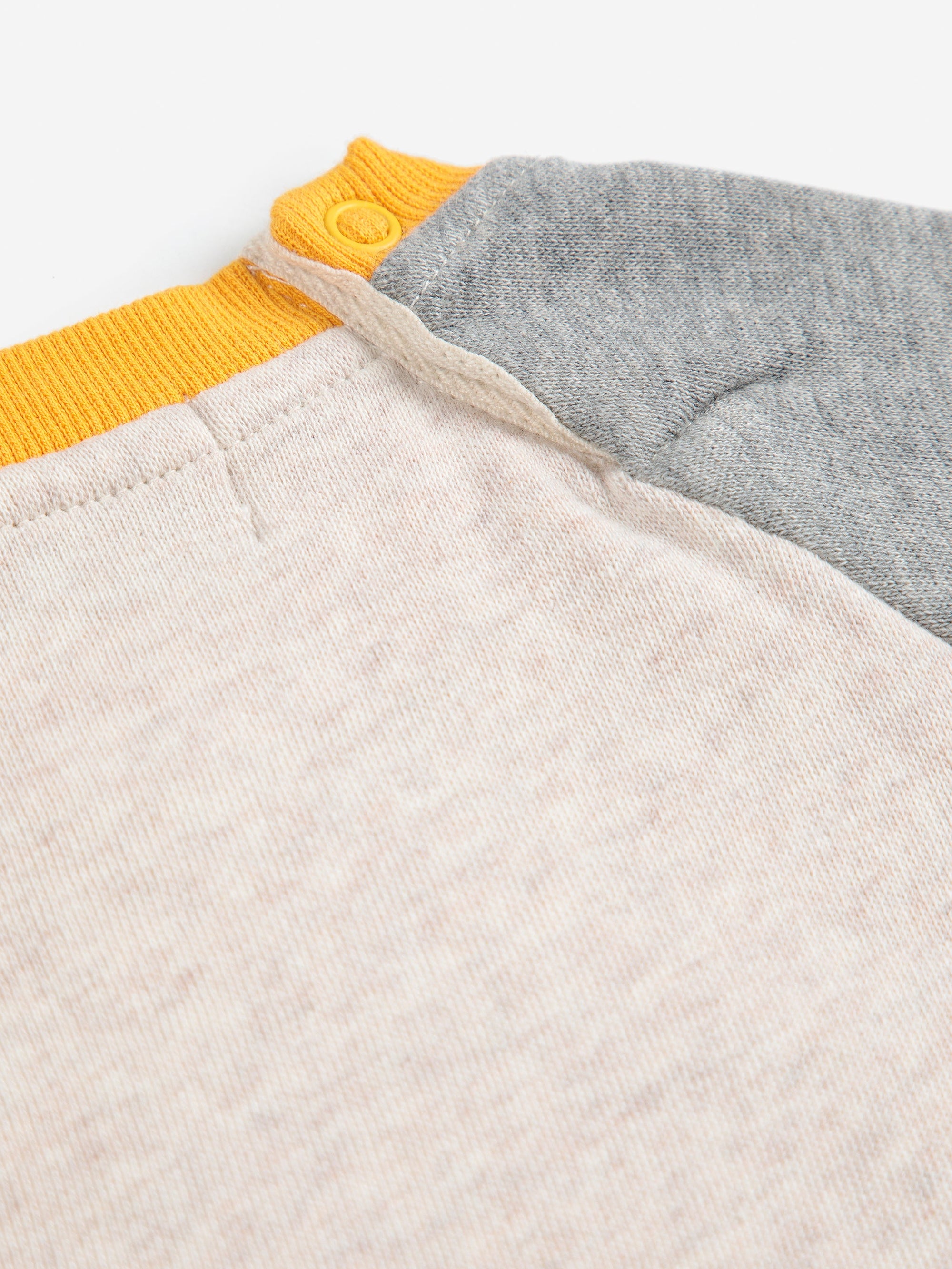 Light heather grey sweatshirt. Designed with long sleeves, raglan sleeves, shoulder snap fastening, ribbed cuffs, loose fit, ribbed bottom, round neck and inner brush fleece. Made in Portugal.
