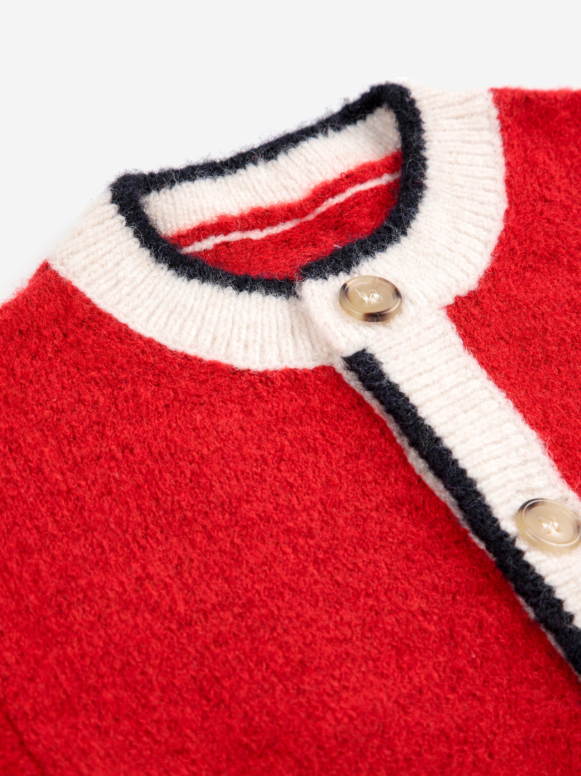 Red cardigan. Designed with long sleeves, dropped shoulder, front button fastening, ribbed cuffs, embroidery, intarsia, loose fit, ribbed bottom and round neck. Made in Spain.