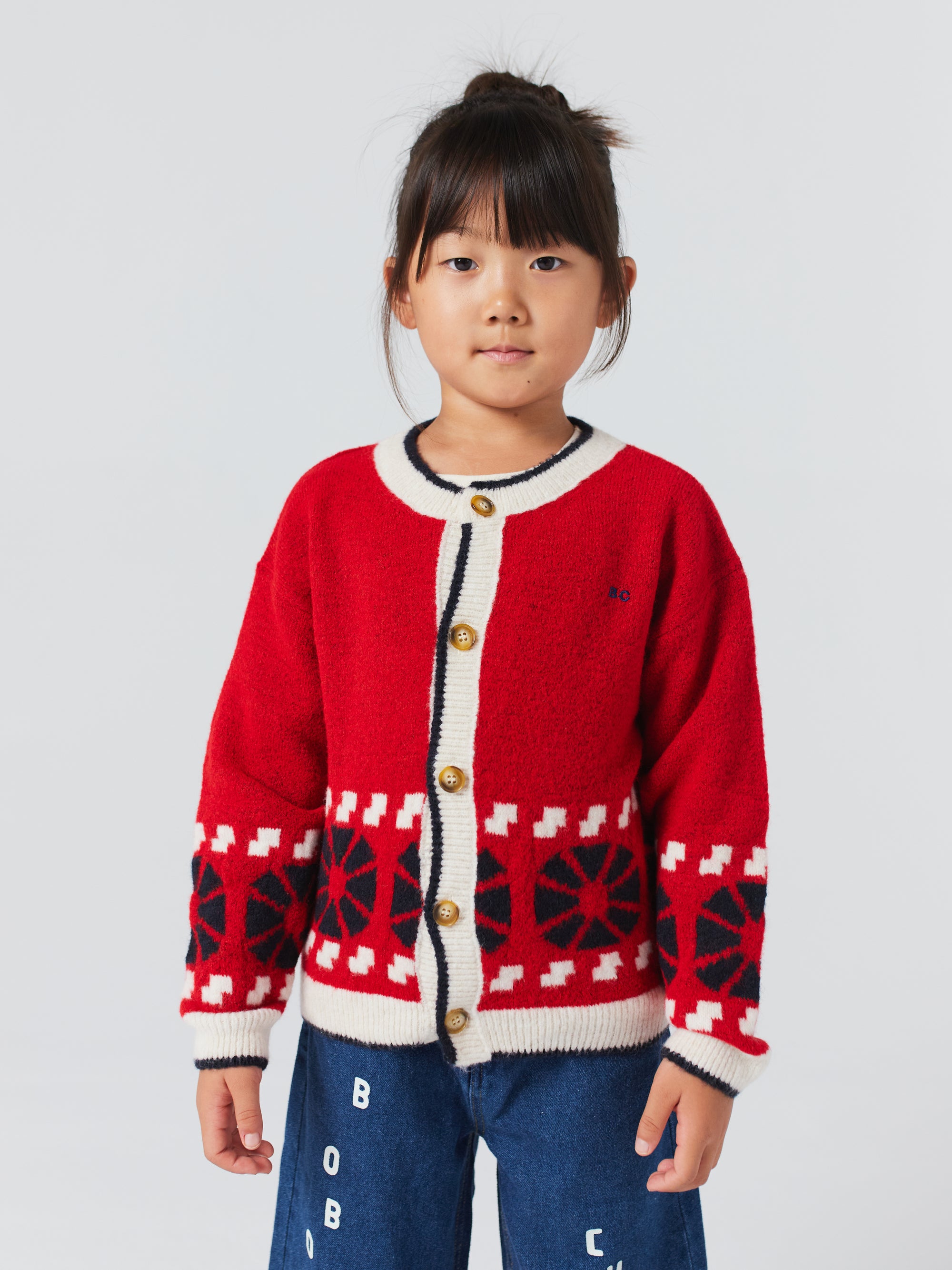 Red cardigan. Designed with crew neck, long sleeves, front button fastening, ribbed cuffs, embroidery, intarsia, loose fit and ribbed bottom. Made in Spain.