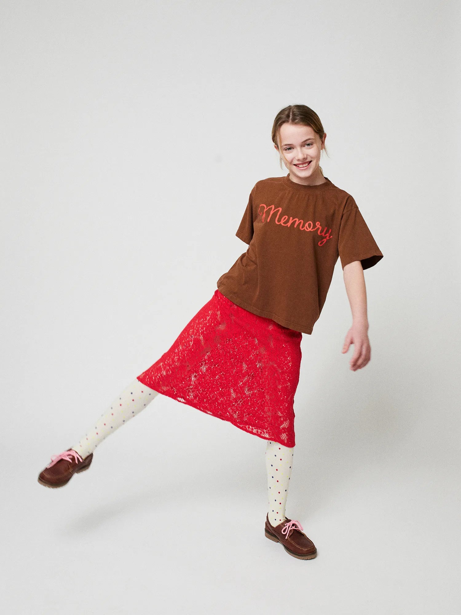 50% Cotton, 20% Polyester, 30% Recycled Cotton red skirts. Designed with elasticated waistband, evasé fit and midi length. Made in Spain.