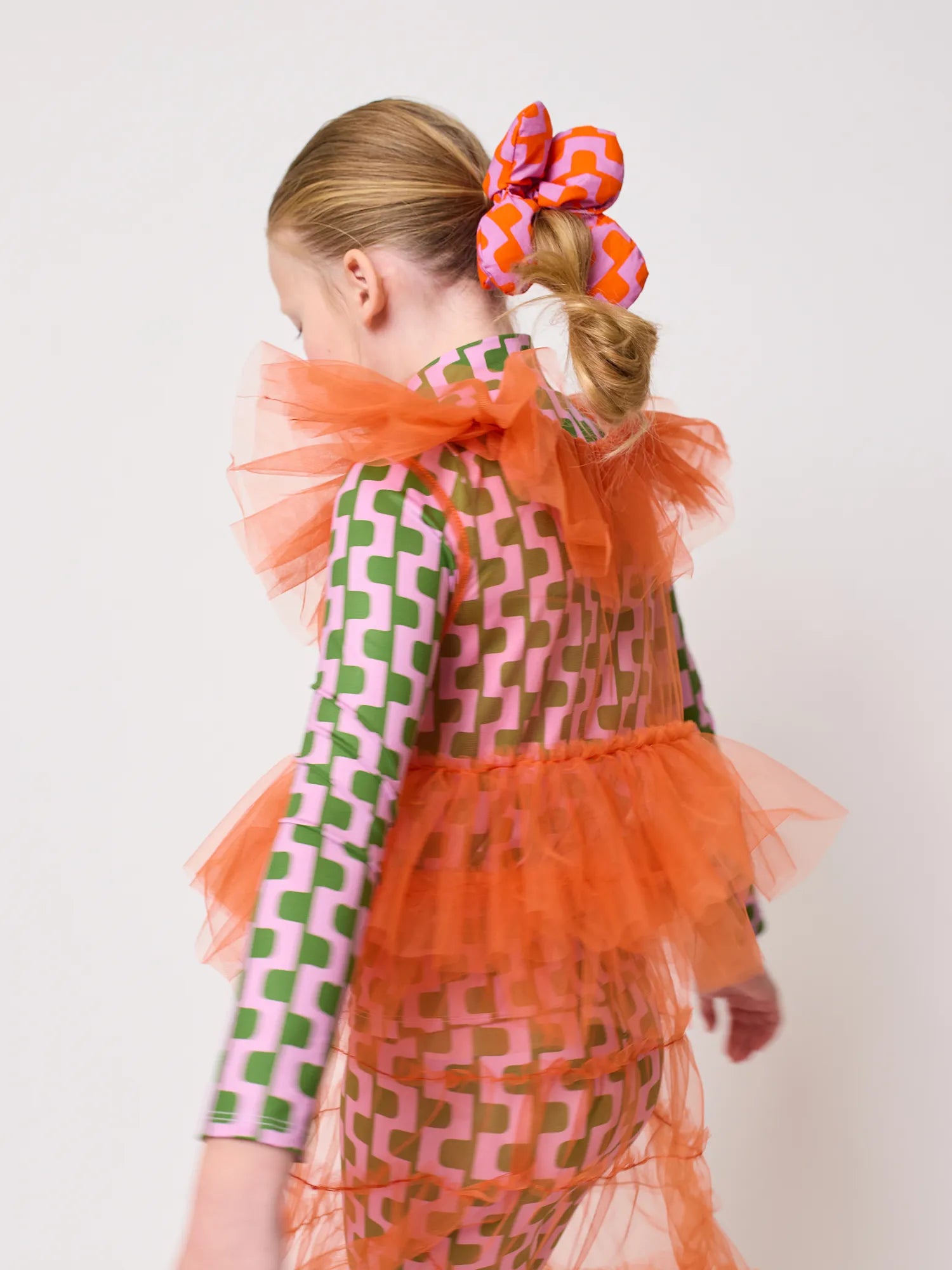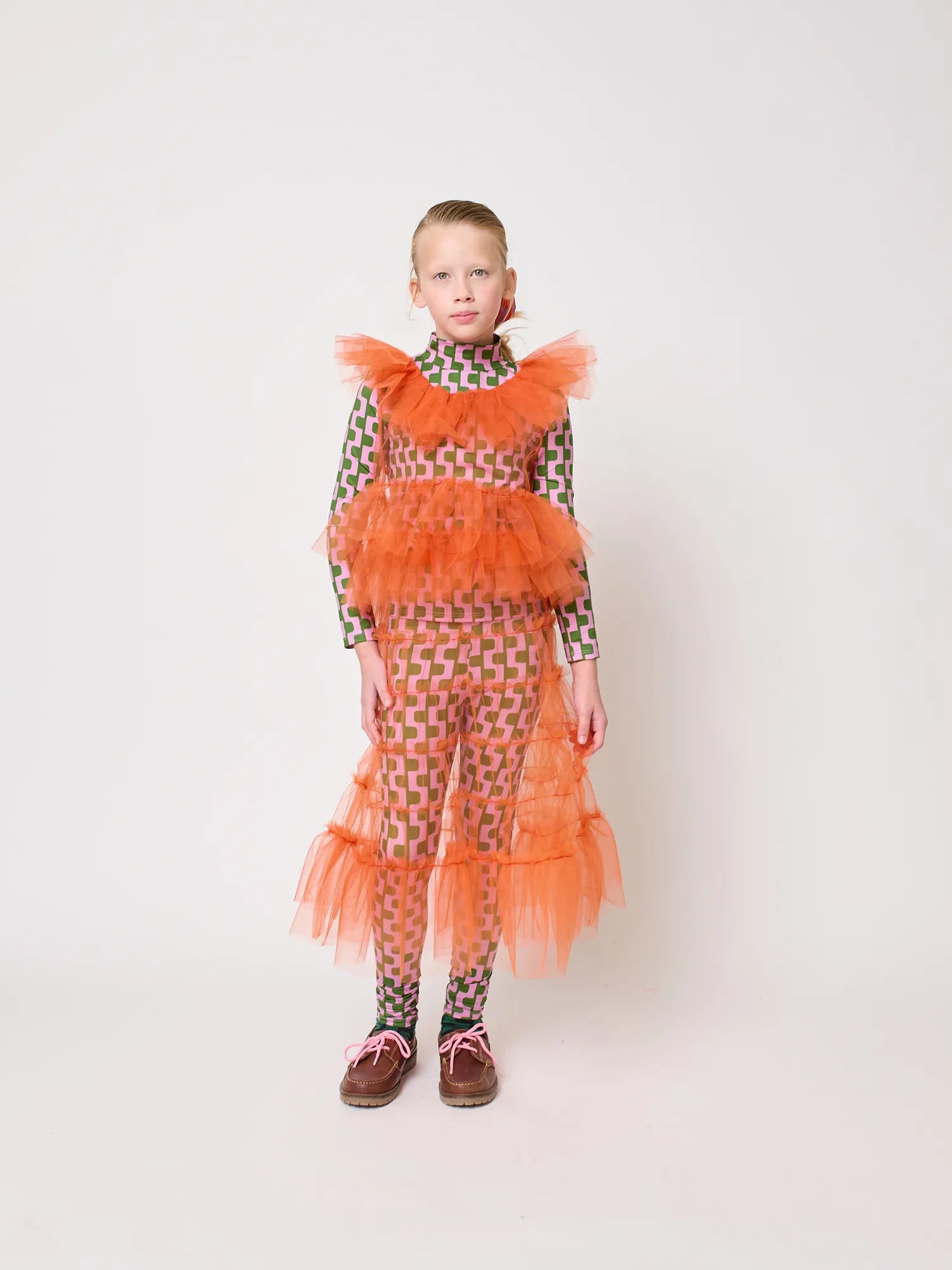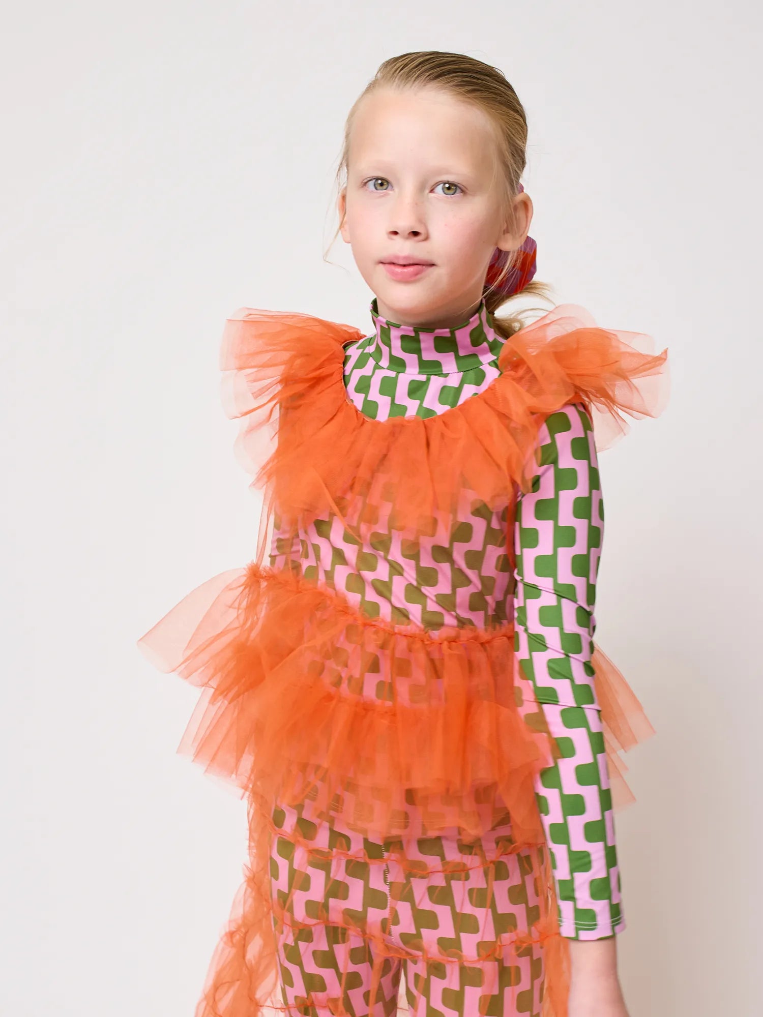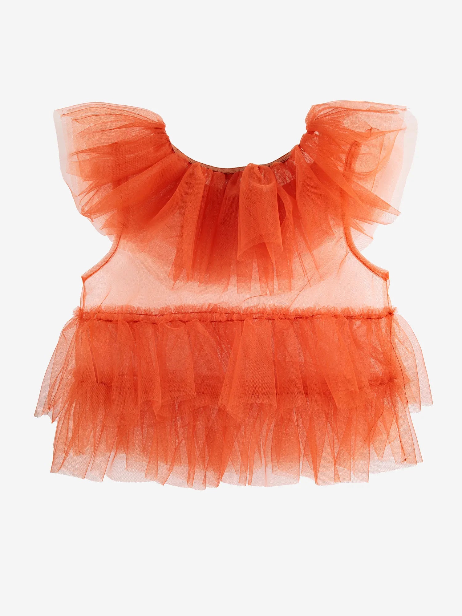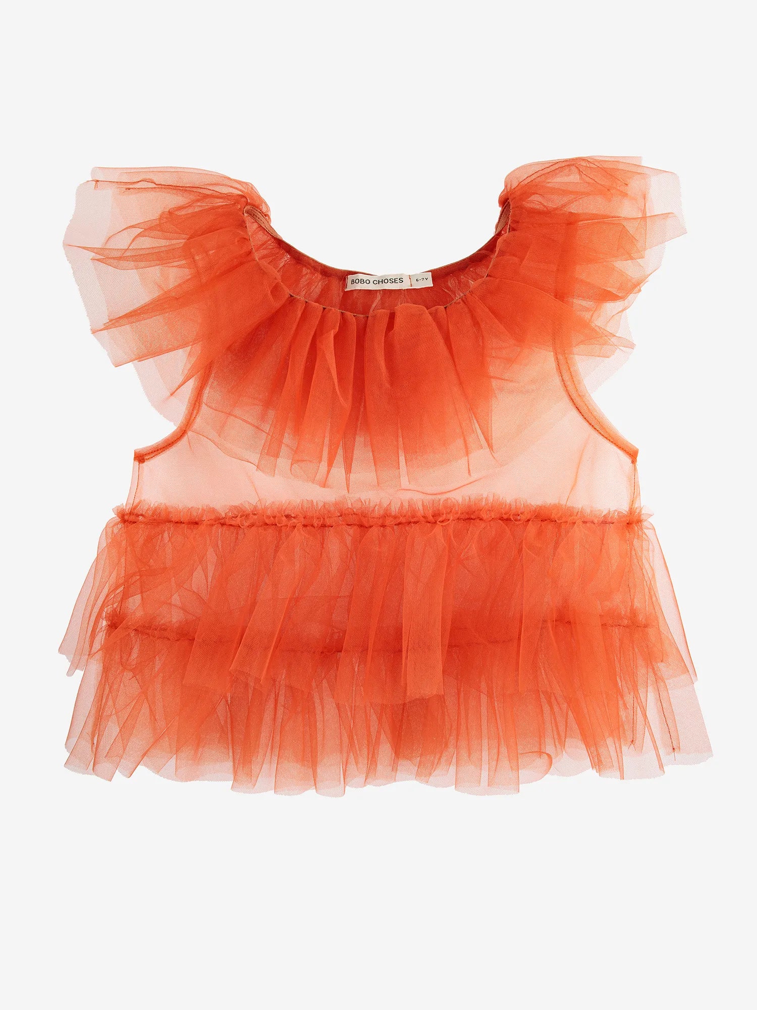 100% Polyester Orange shirt. Designed with sleeveless, back button fastening, gathering detail, loose fit, round neck, ruffle hem and ruffled detailing. Made in Spain.