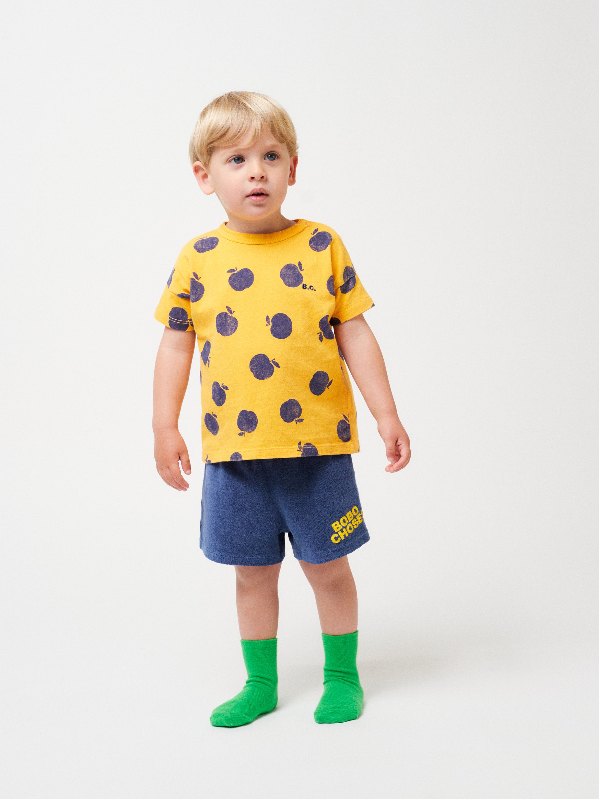The fun yellow colour of our "Poma" t-shirt, featuring a print full of our iconic apples in midnight blue tone, will instantly awaken your baby's innate curiosity to discover the world. Craft to take care of these little explorers, we've designed this garment to keep them cool and dry throughout all their adventures.